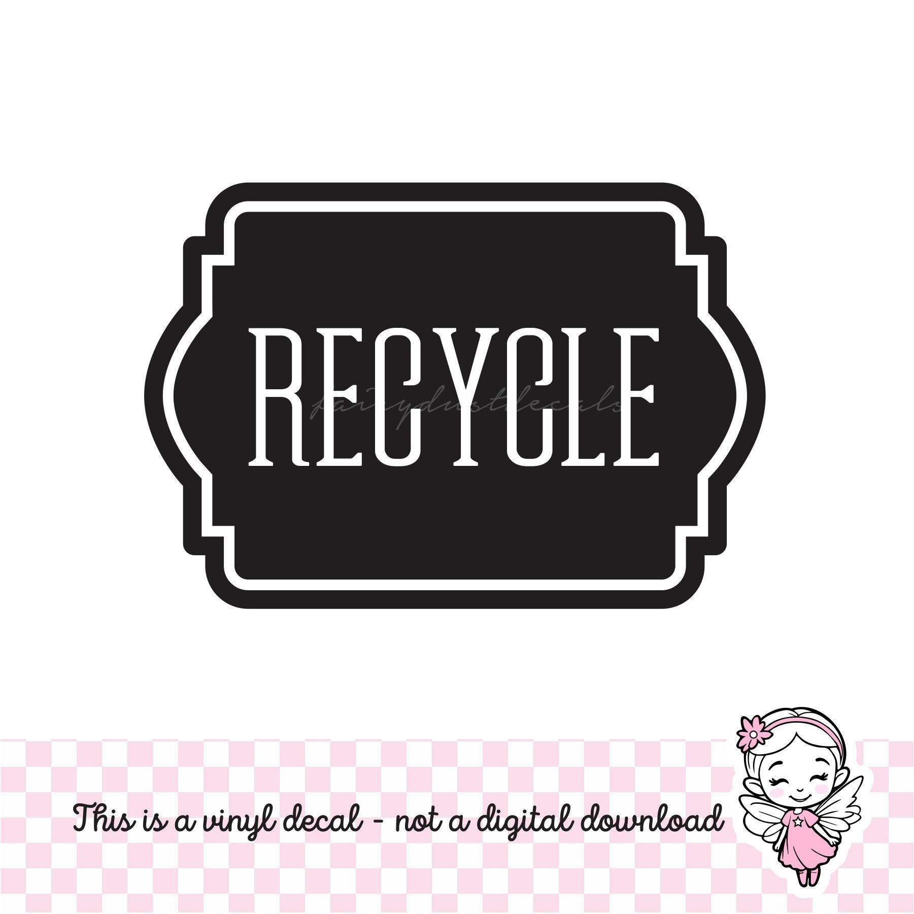 RECYCLE DECAL. Decorate a plain recycle tote with this easy-to-apply vinyl decal sticker (letters and stripe are cutout details). Our original decal designs are perfect for your home decorating and sign making projects! Computer cut letters and designs made from the highest quality Oracal brand vinyl, available in two finishes: Matte and Gloss. We offer a variety of sizes, practice decals with every order and full color step-by-step instructions.