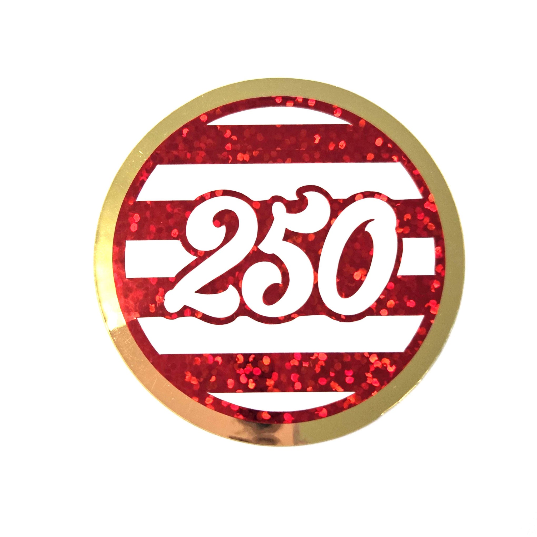 Honor America's historic 250th anniversary with this stunning two-piece sticker collection. Each design is crafted from genuine sparkly adhesive vinyl—not printed—ensuring vibrant color and lasting shine. The first sticker boldly displays "250" in striking red and white stripes framed by elegant gold trim, while the second captures "1776" surrounded by shimmering stars on a glittery blue canvas, also accented with gold. Whether decorating your laptop, water bottle, or journal, these eye-catching stickers let you proudly commemorate this milestone moment with style and patriotism.