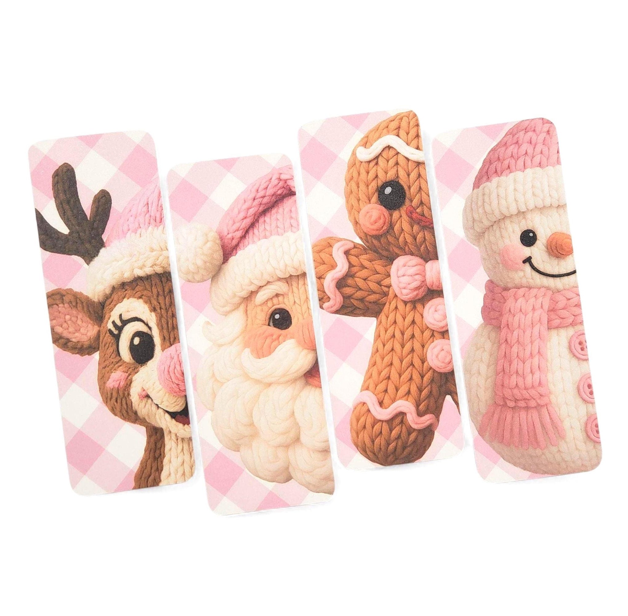 Add a cozy touch to your holiday reading with these adorable bookmarks! The designs look like a knitted reindeer, Santa Claus, gingerbread man and snowman peeking out against a pink gingham background — sweet, festive, and oh-so-charming.