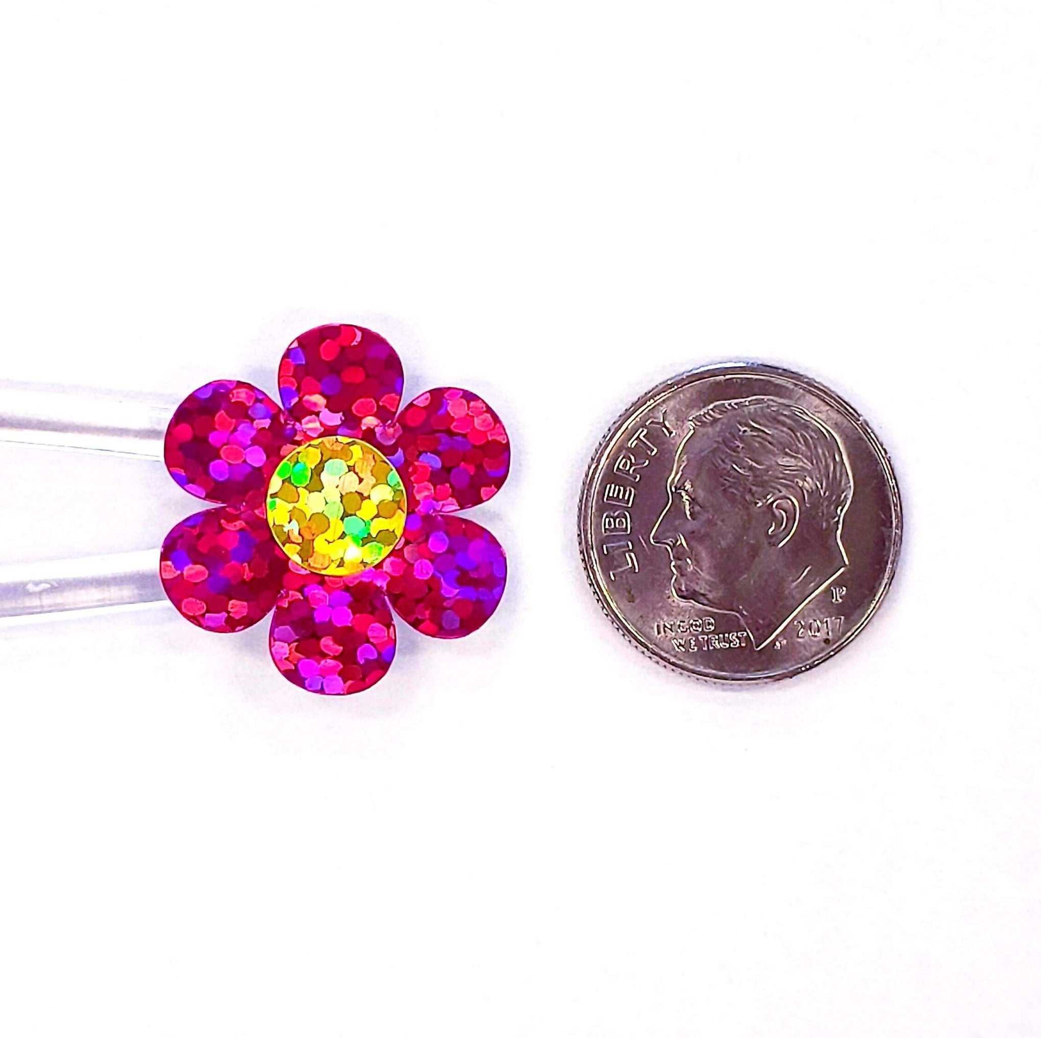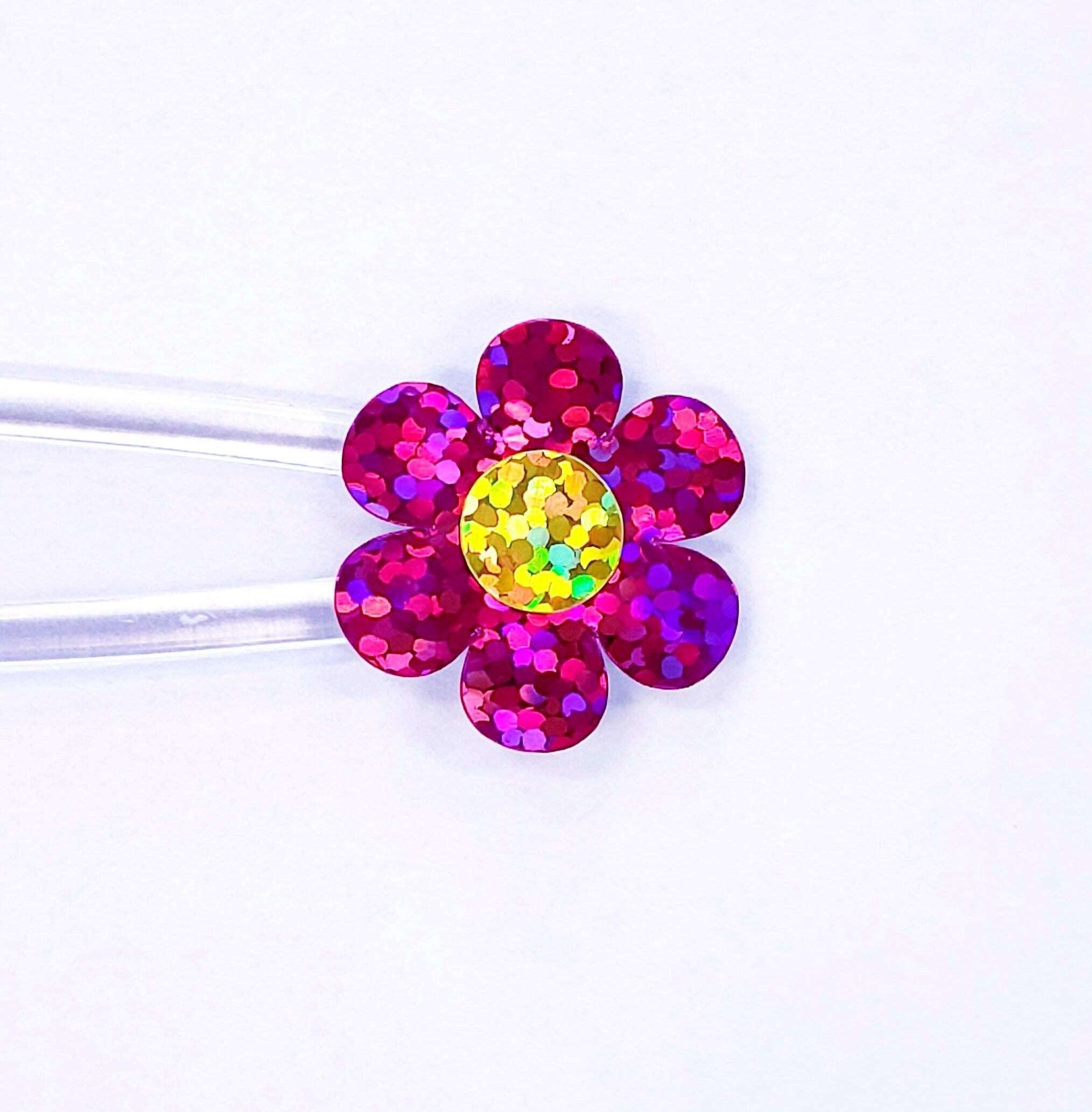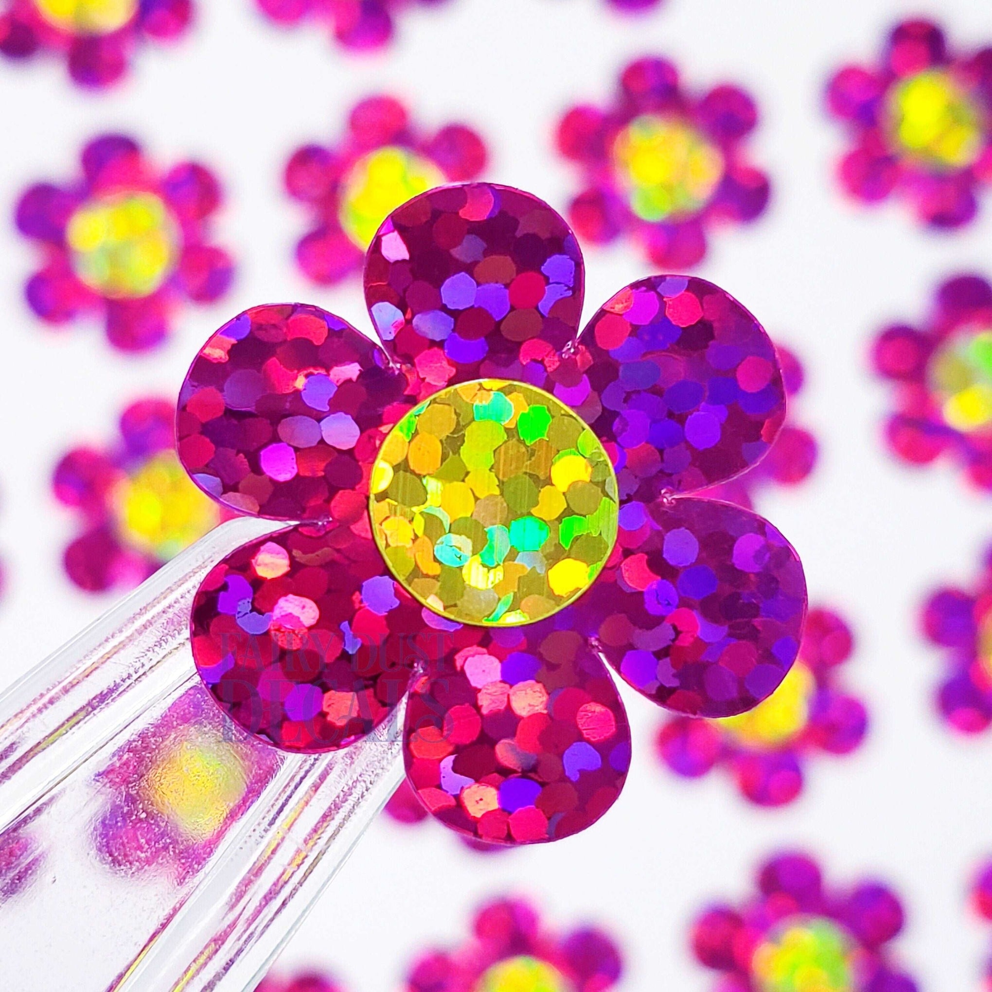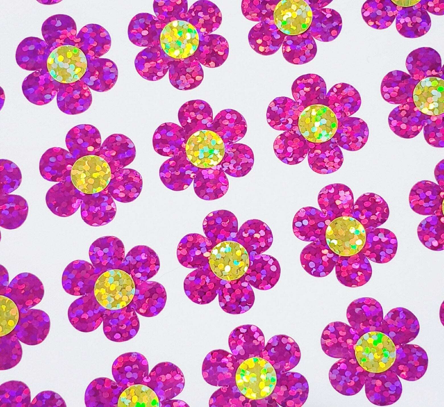Small daisy stickers with a retro 1970s style, featuring hot pink and yellow glitter flowers. The set includes flower stickers that don't require transfer tape or a clear overlay. They are made from permanent adhesive vinyl and can be applied to a variety of surfaces, including paper, cardboard, calendars, planners, phone cases, laptops, keychains, plastic, metal, glass, and painted wood. Please note that stickers applied to drinkware should be handwashed.
