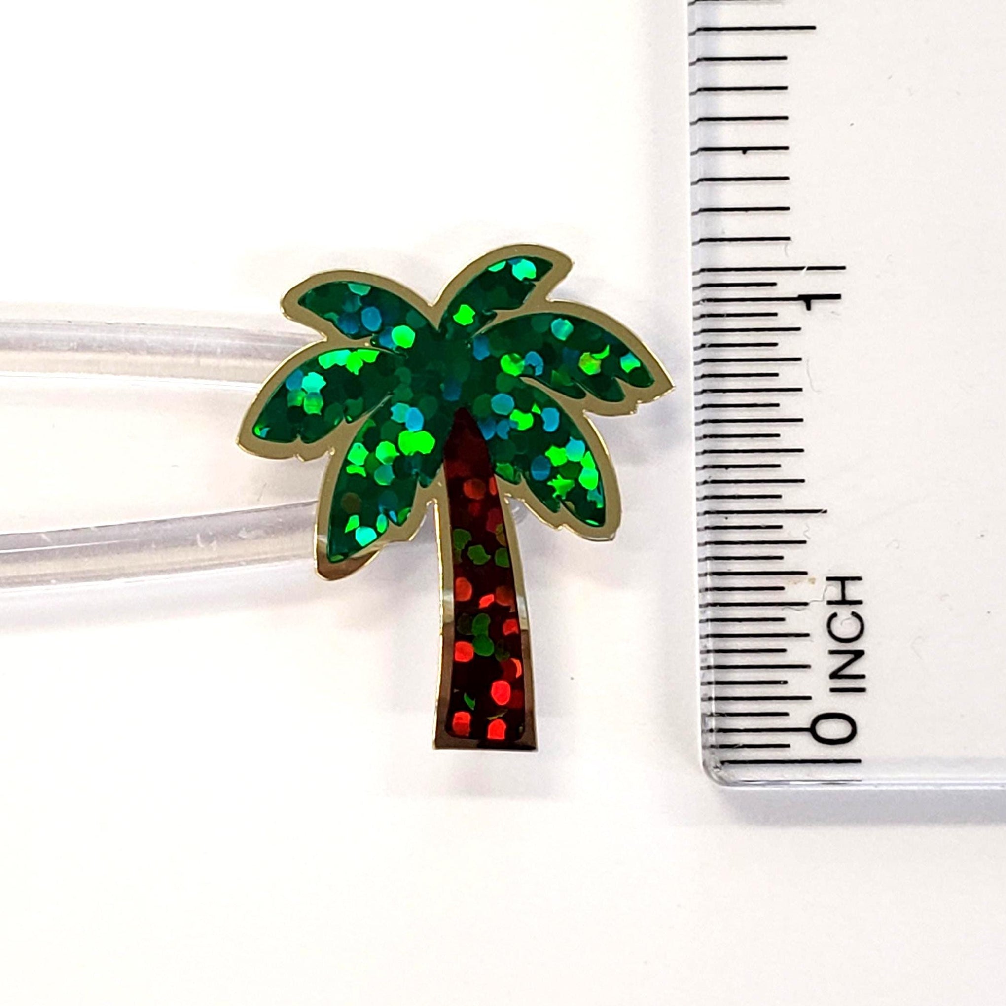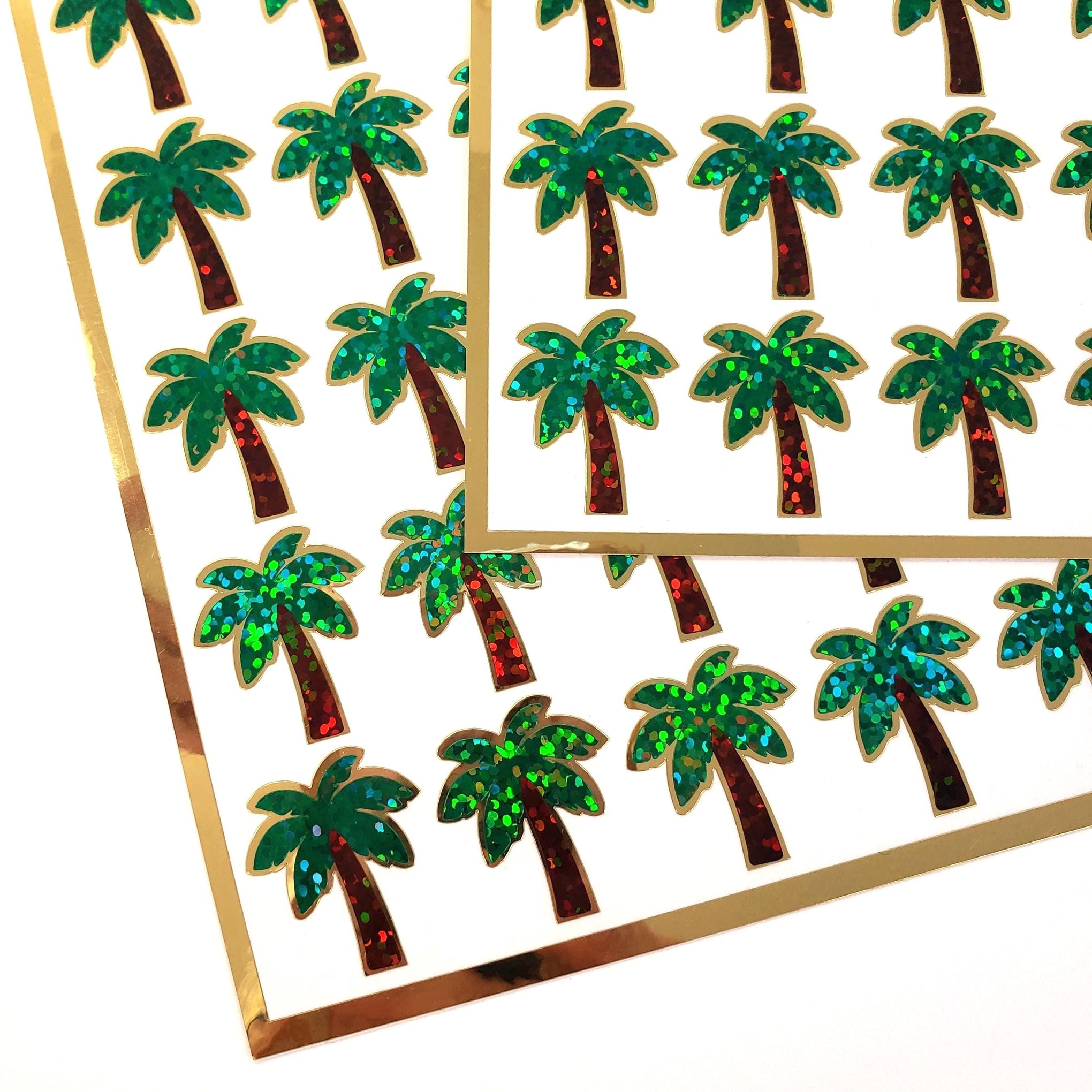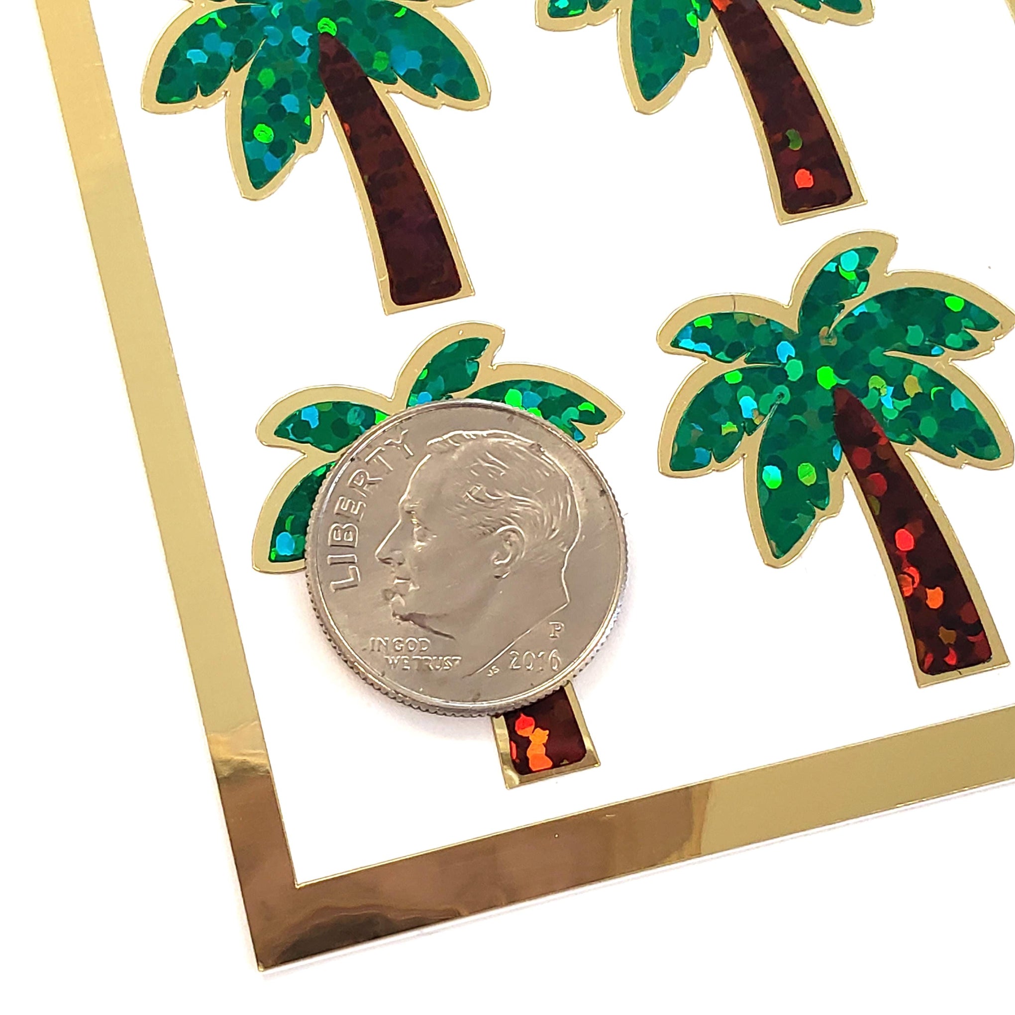 Add a touch of the tropics to your party decorations with our Sparkly Palm Tree Stickers. These small palm tree decals are crafted from adhesive vinyl in green and brown glitter with a gold outline, perfect for creating a festive vibe at your Hawaiian luau or beach-themed birthday celebration. With no transfer tape required, simply peel and affix these stickers to your desired surface, whether it's paper, cardboard, signs, planners, laptops, journals, drink cups, envelopes, scrapbooks, phone cases, headphones, keychains, plastic, metal, glass, painted wood, and more.