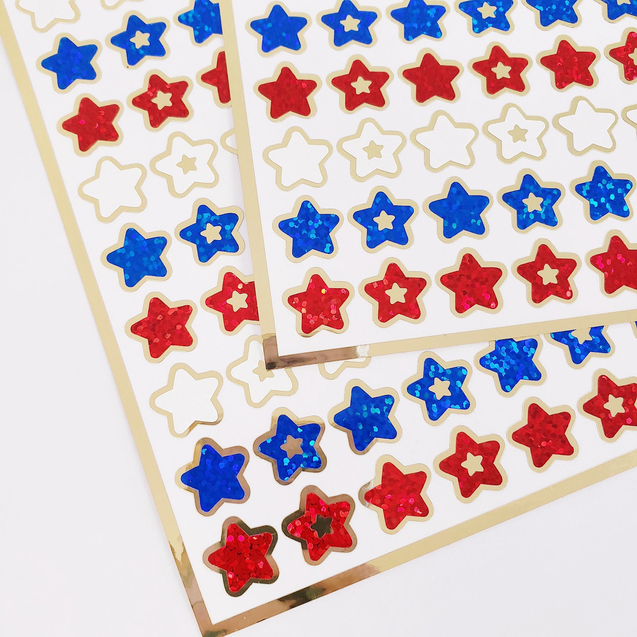 Discover a set of 70 patriotic star stickers in red, white, and blue, each adorned with a mirror gold outline. These small stickers are an excellent choice for adding a distinctive touch to your upcoming projects. Ideal for military cards, Memorial Day decorations, Fourth of July parties, scrapbooking, or any other papercraft imaginable. Plus, they're easy to use with no transfer tape needed—just the stars.