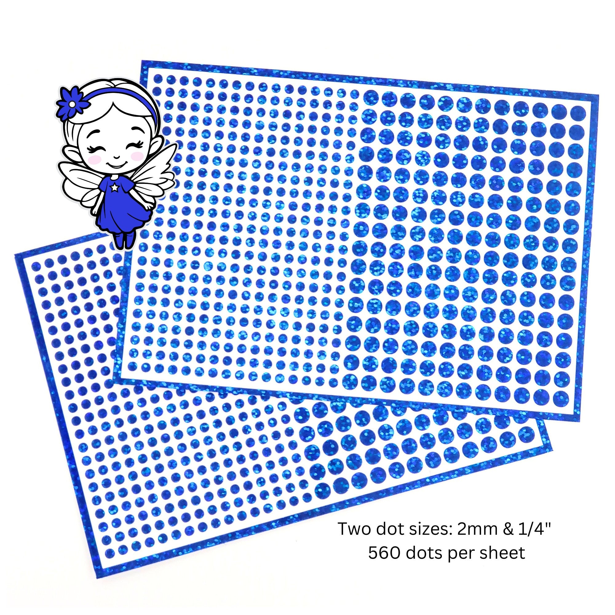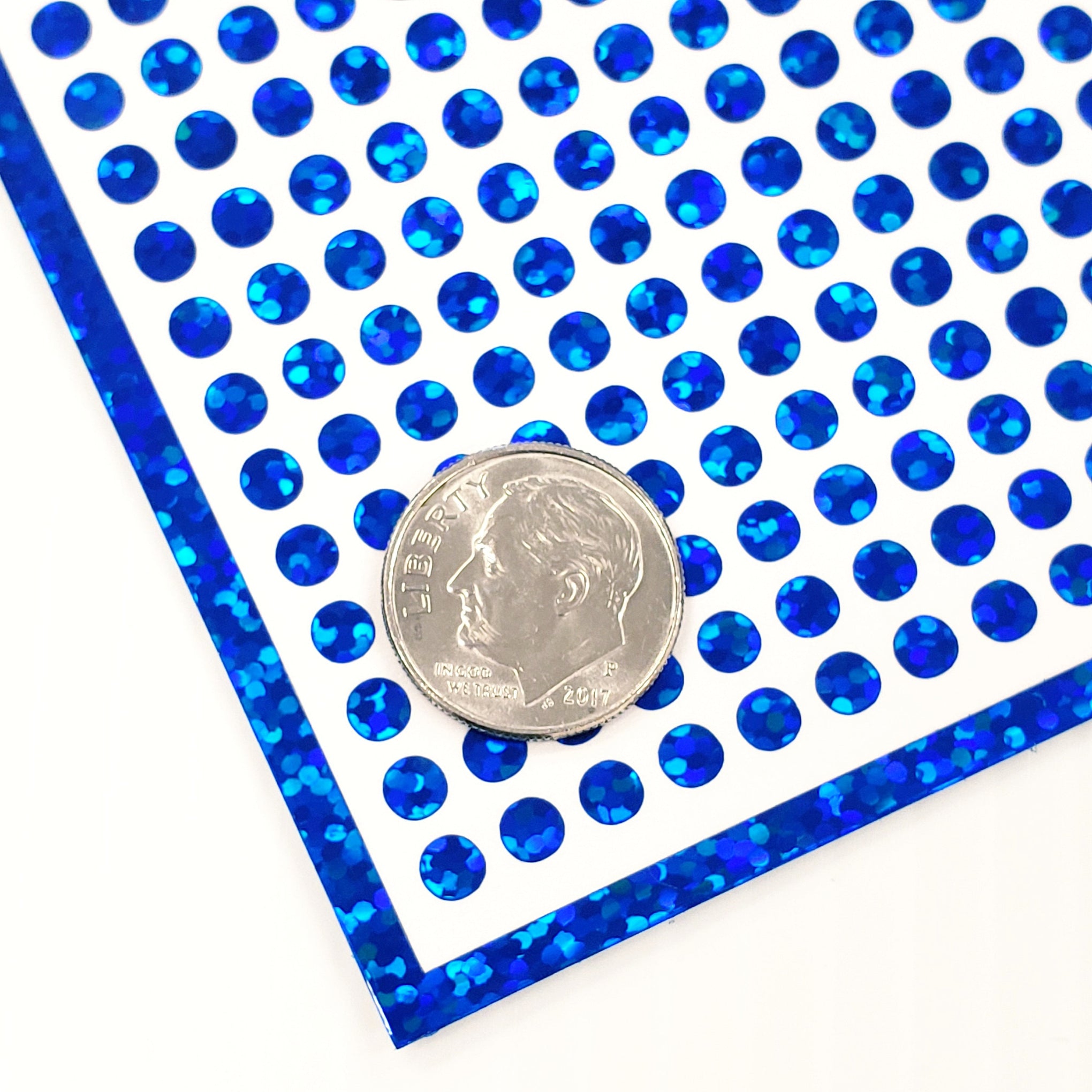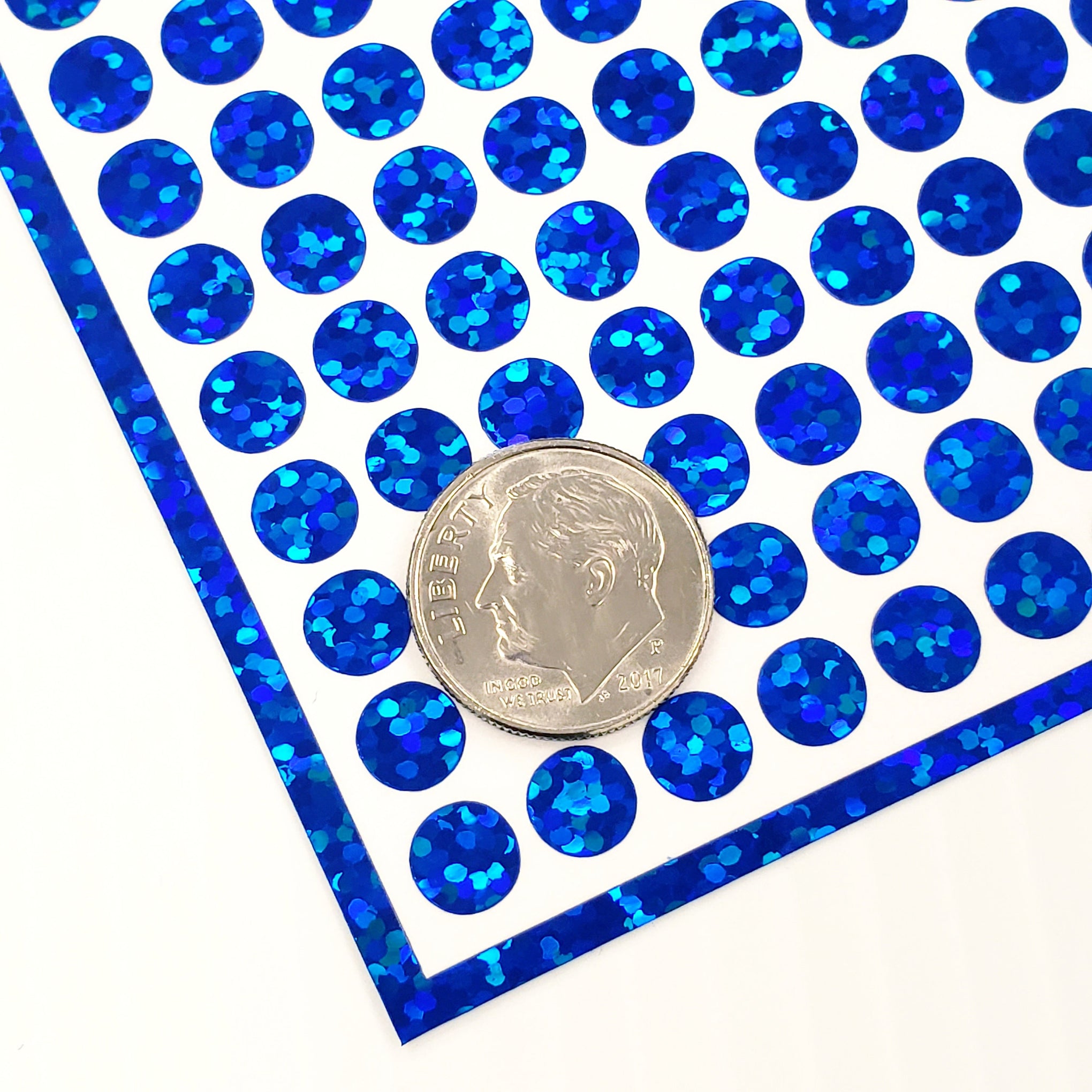 Set of 560 micro 2mm and 1/4" sized blue glitter dot stickers. No transfer tape needed, just the dots! The stickers are made from vinyl and will adhere to paper, cardboard, notecards, place cards, ornaments, envelopes, daily journals, period tracker chart, badge reels, photo card sleeves, invitations, planners, phone cases, laptops, keychains, nails, plastic, metal, glass, painted wood and many more smooth surfaces. Dots are smooth to the touch and will not shed.
