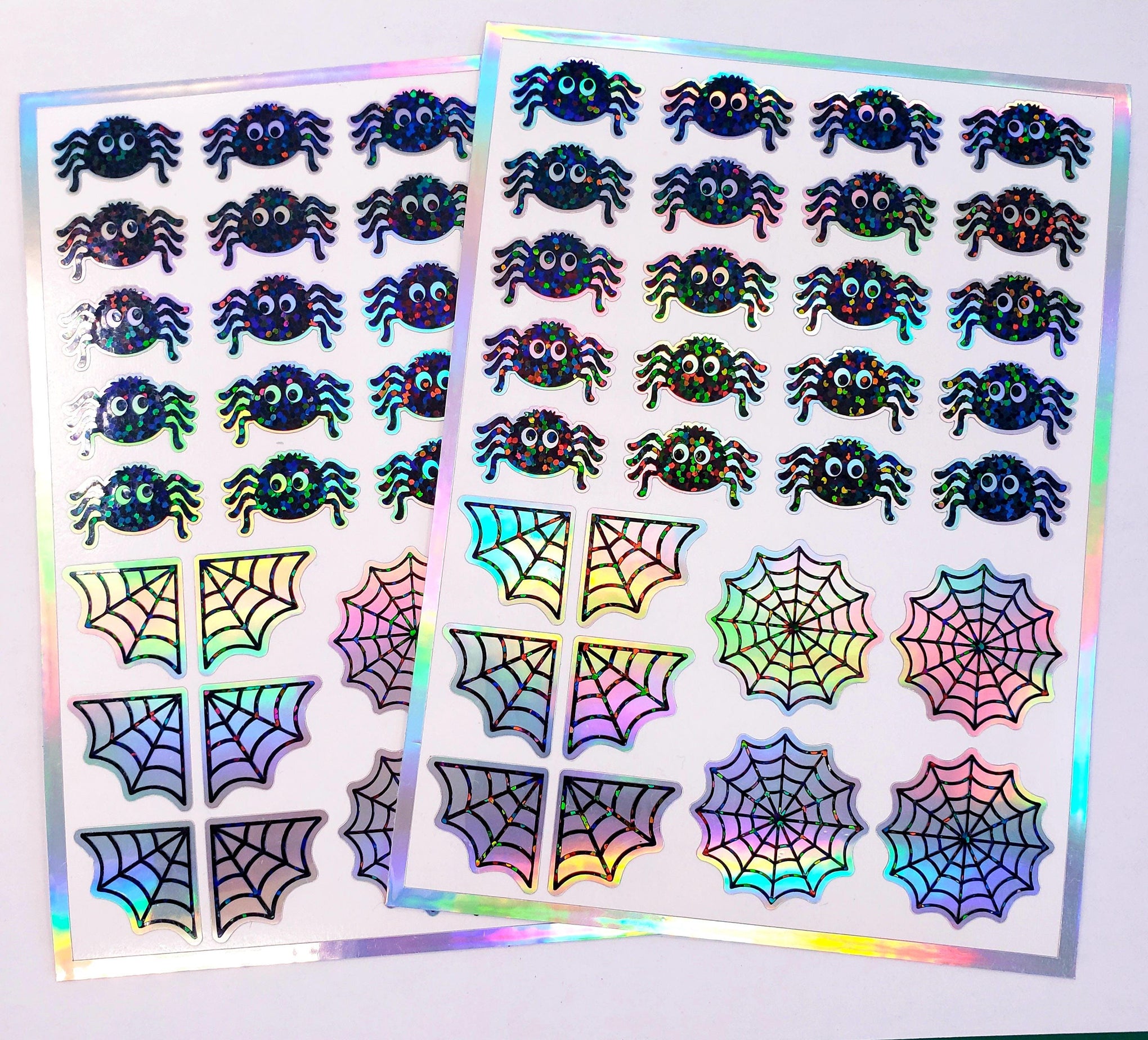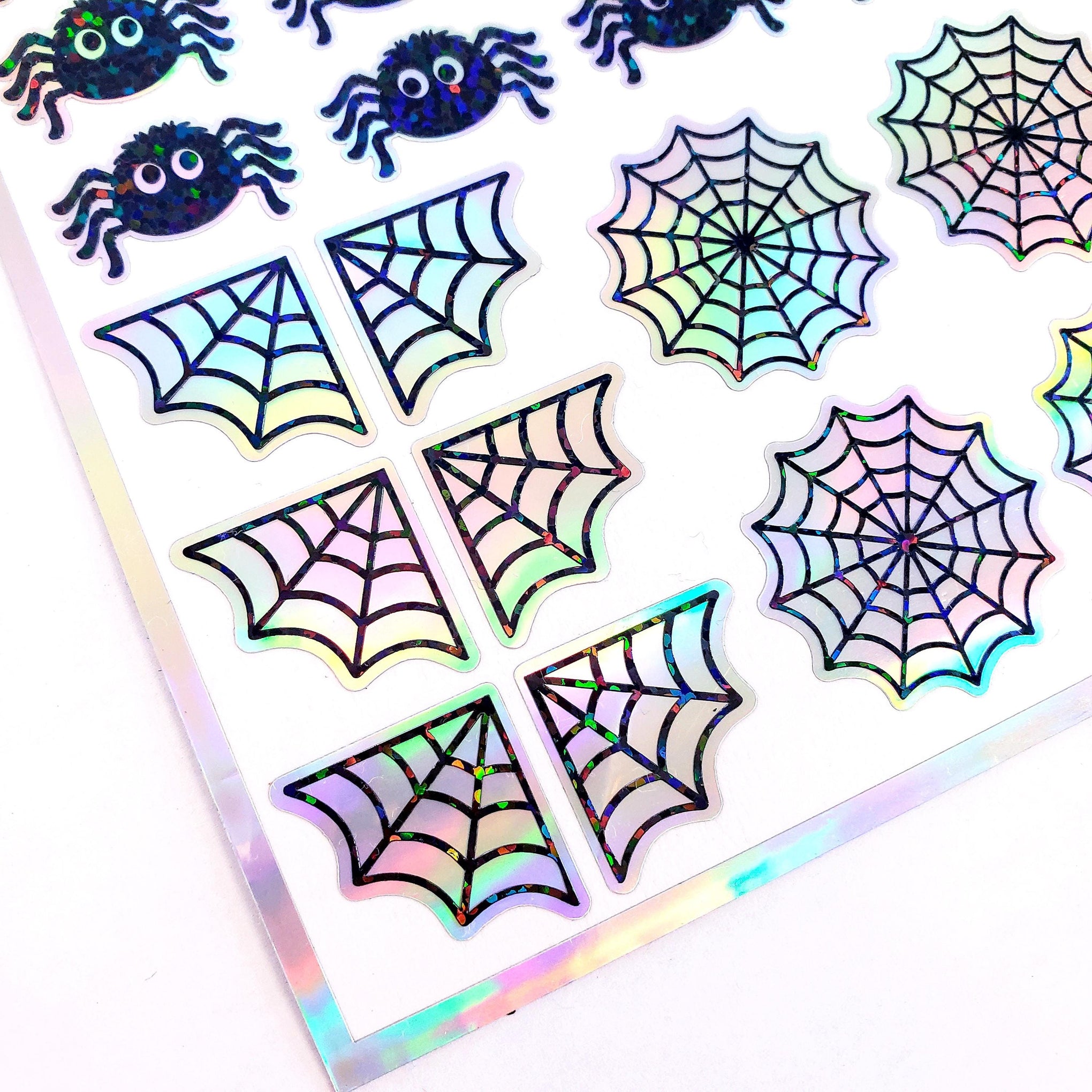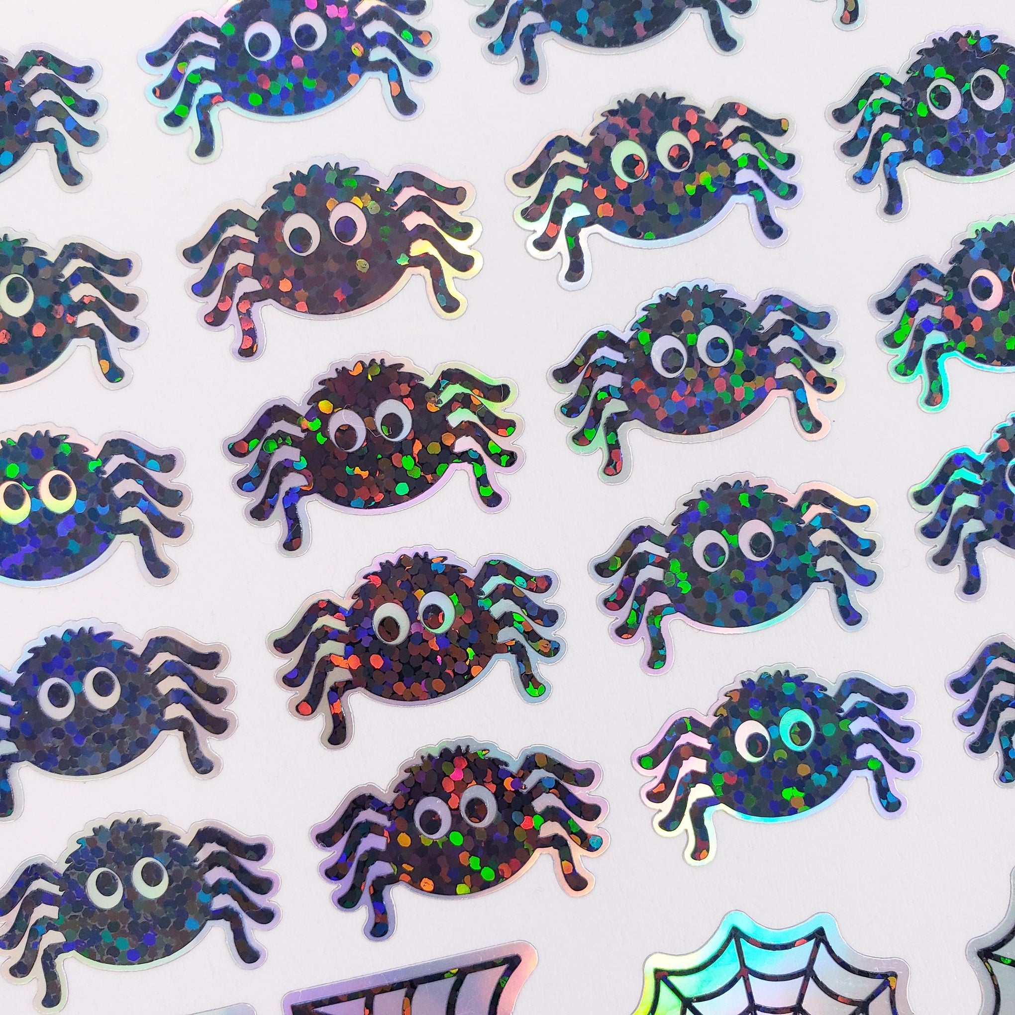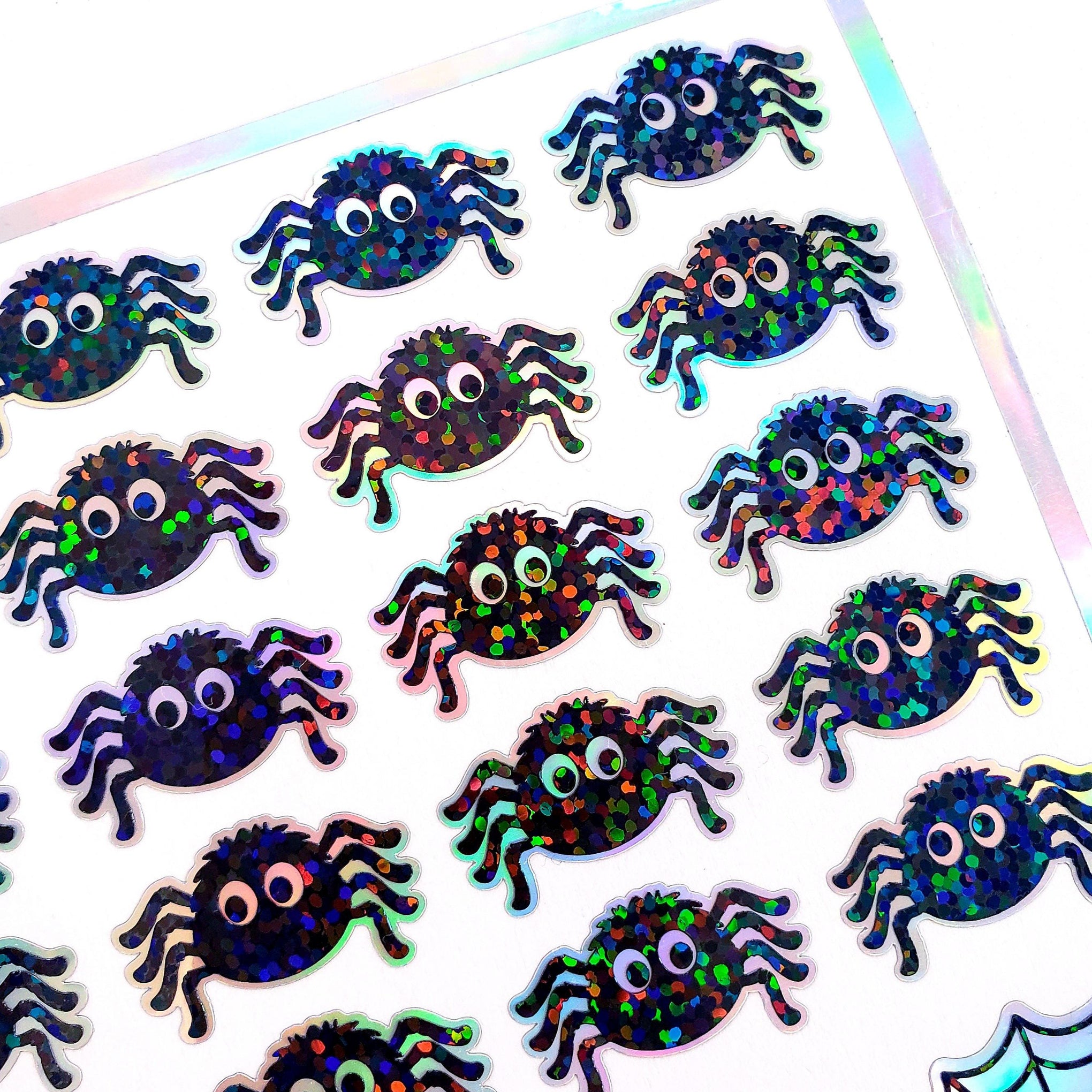 Halloween spider sticker sheet. Set of 30 peel and stick sparkly cute black spiders and spider webs.