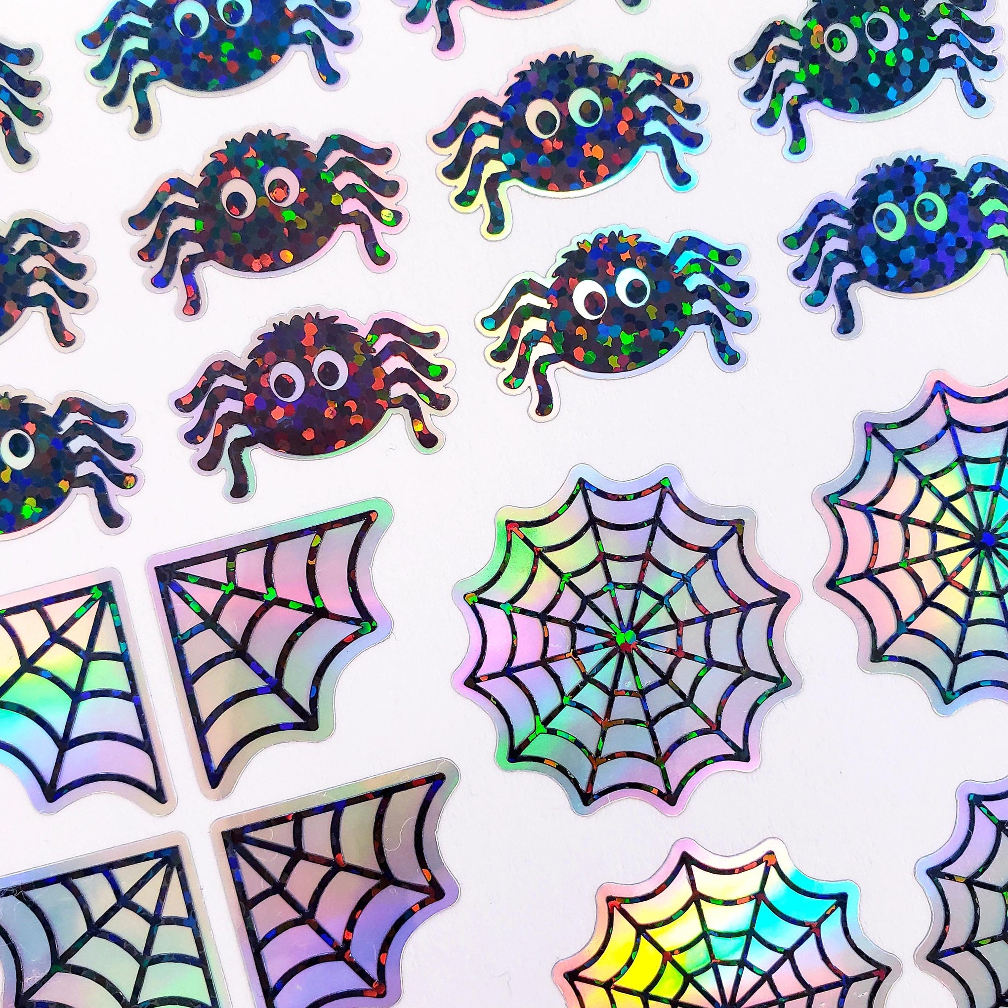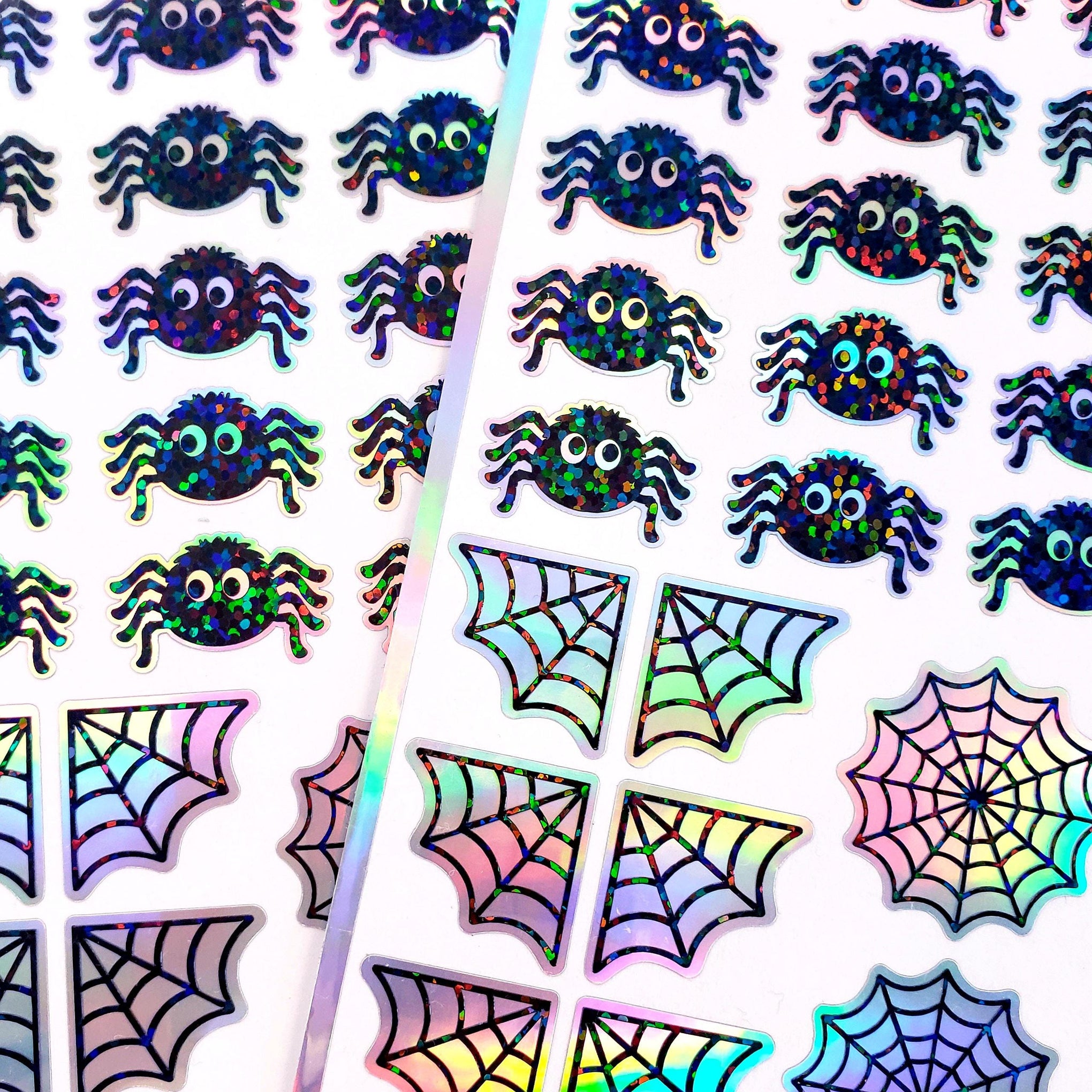 Set of 30 sparkly cute Halloween spiders and web stickers. Each sticker varies in size from just under an inch to 1.25 inches. Perfect size for phone covers, cards, tumblers, notebooks, ornaments, journals and so much more.