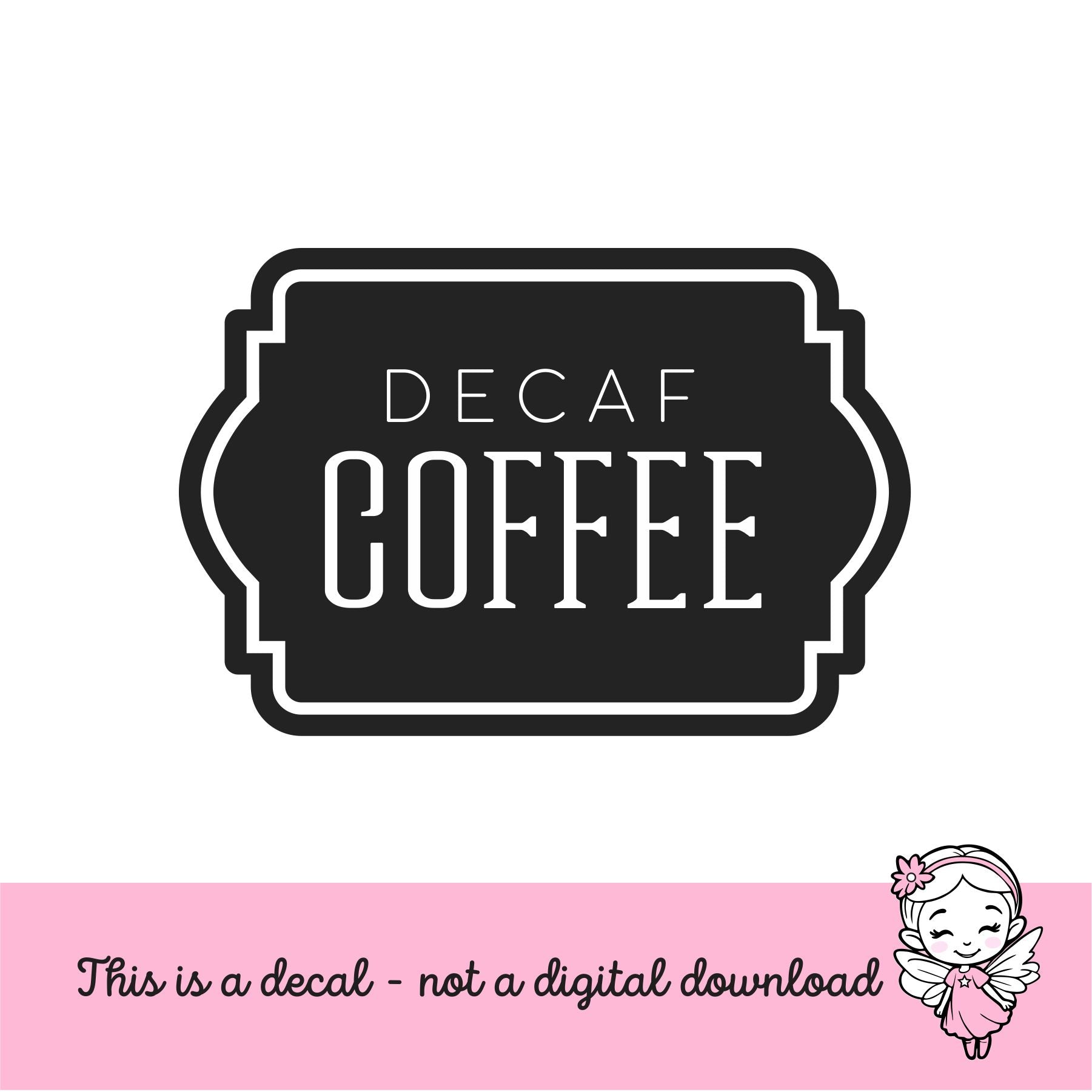 DECAF COFFEE DECAL. Decorate plain metal carafes or kitchen canisters with this easy-to-apply vinyl decal sticker. Available in two sizes. The decals are all original designs (not clipart!) and has a farmhouse retro vibe. The letters and the border stripe are "cutout details" which will show the surface color the decal is applied to. Letters are not white!