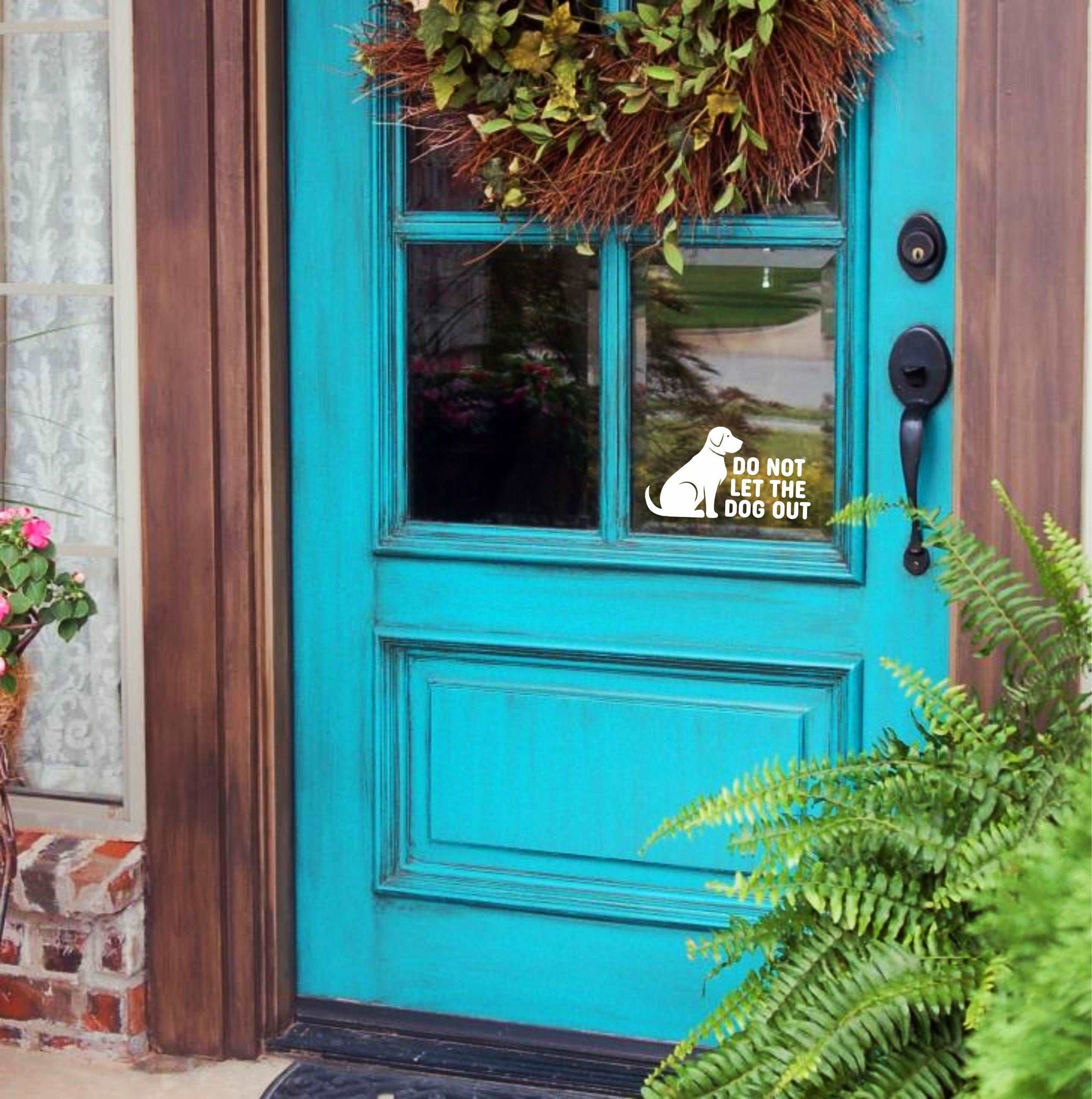 DO NOT LET THE DOG(S) OUT. This vinyl decal is designed to keep your furry friend safe and secure indoors. Measuring at 4 x 7 inches, it's the perfect size for placing on your front door as a friendly reminder to guests and family members to be mindful of your pet's presence. The decal is intended for one-time use and will adhere well to a variety of clean and smooth surfaces like mirrors, glass, metal, plastic, painted wood, and both interior and exterior front doors. Keep your dog indoors and protected with this easy-to-use decal.