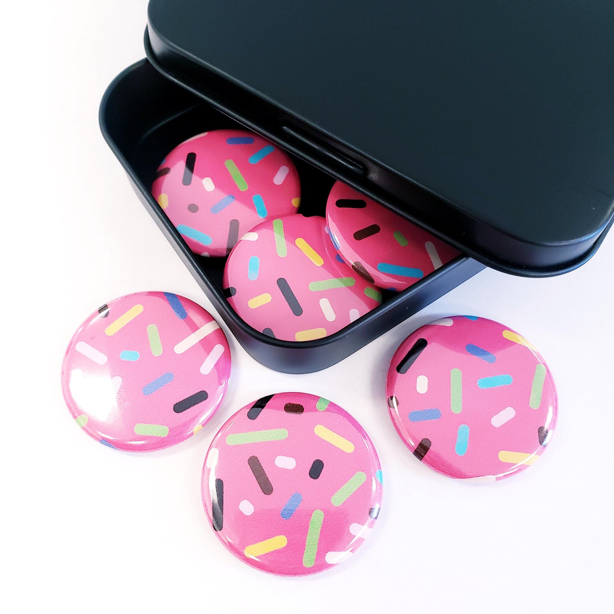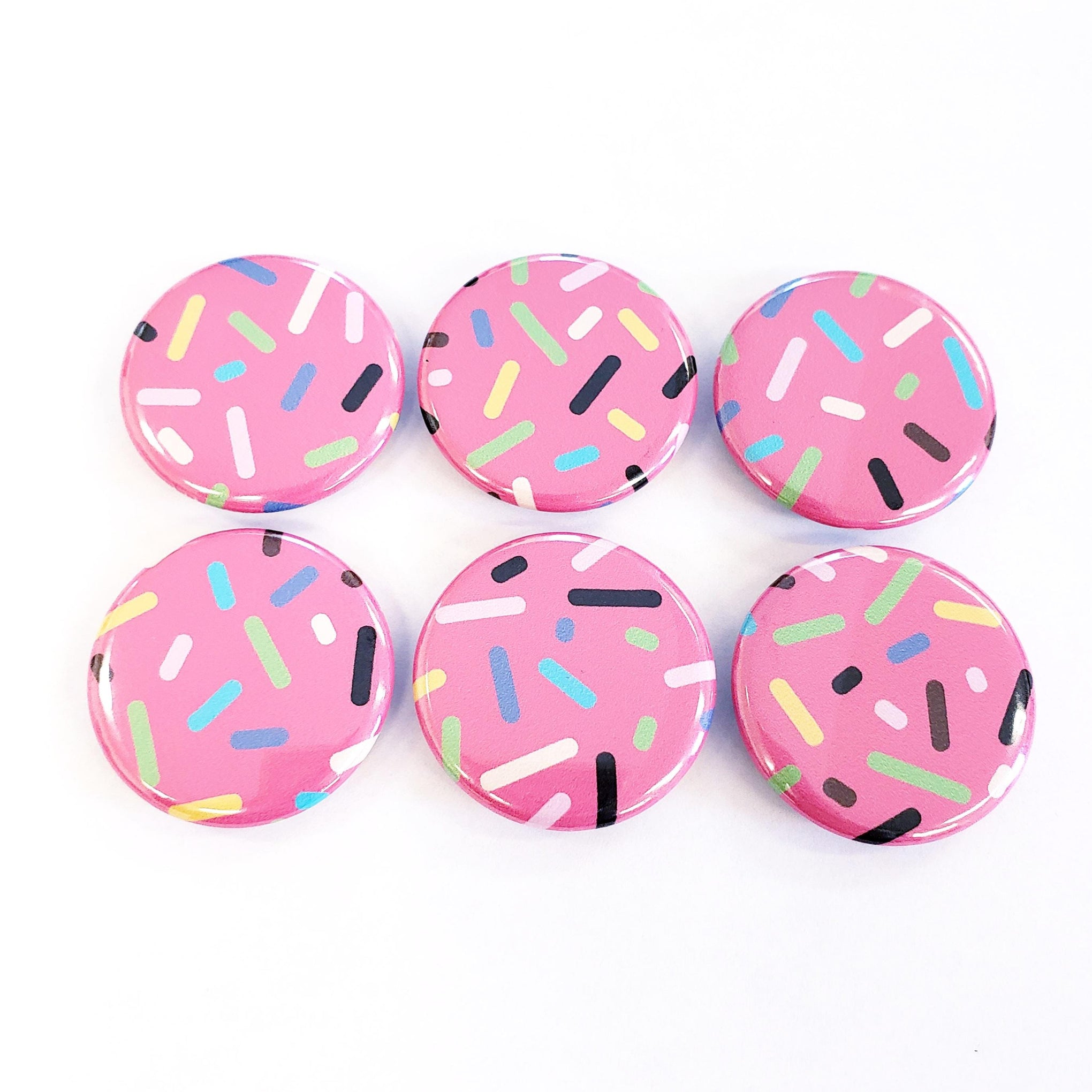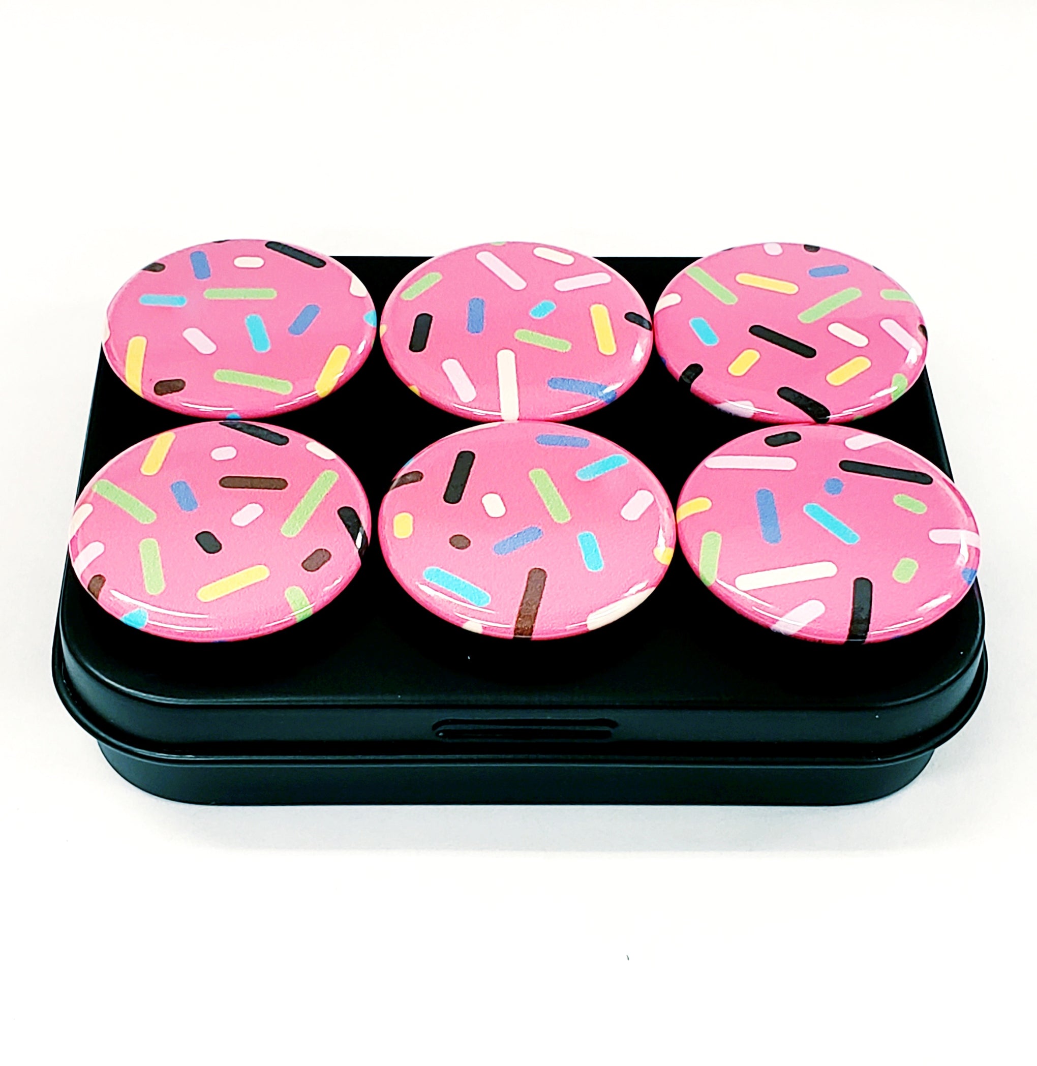 Collection of six round, cute pink cupcake sprinkle pattern button magnets. Perfect for adorning your refrigerator or any metal surface.