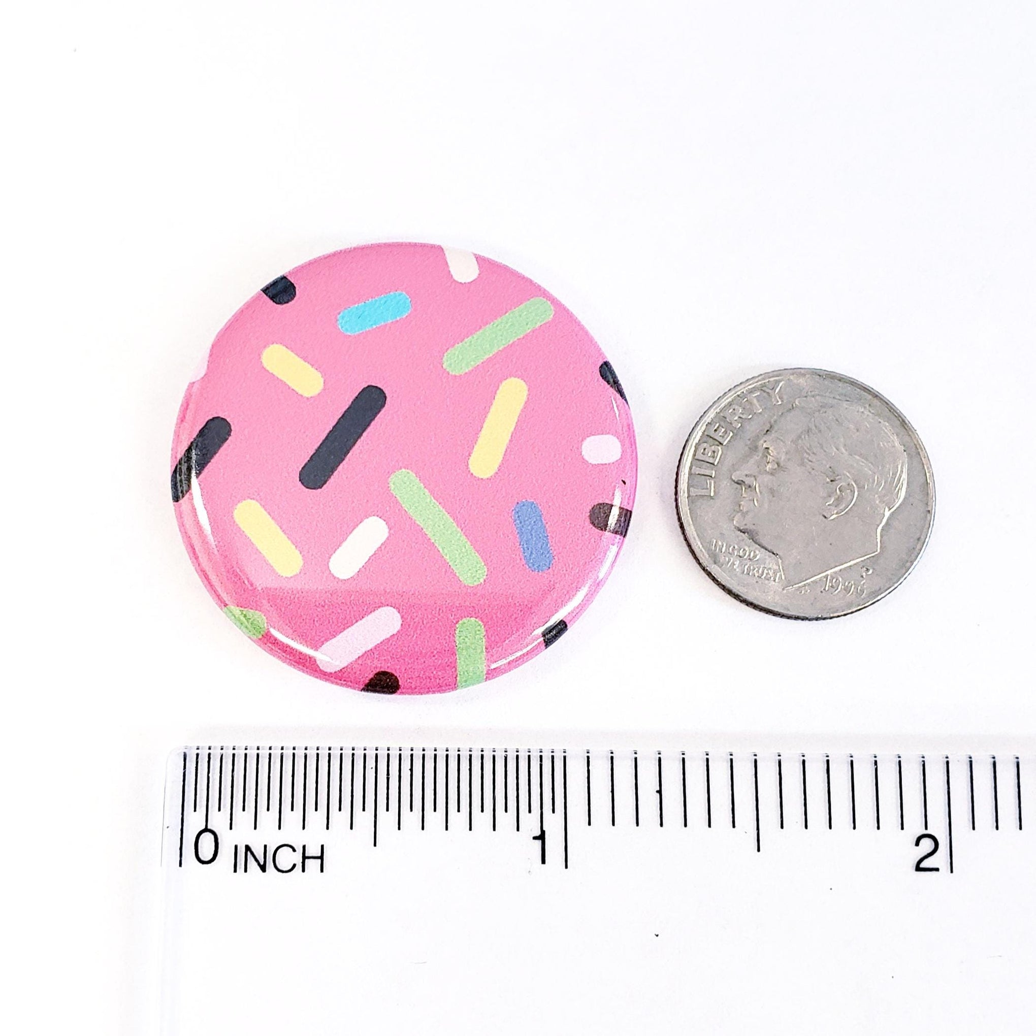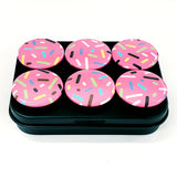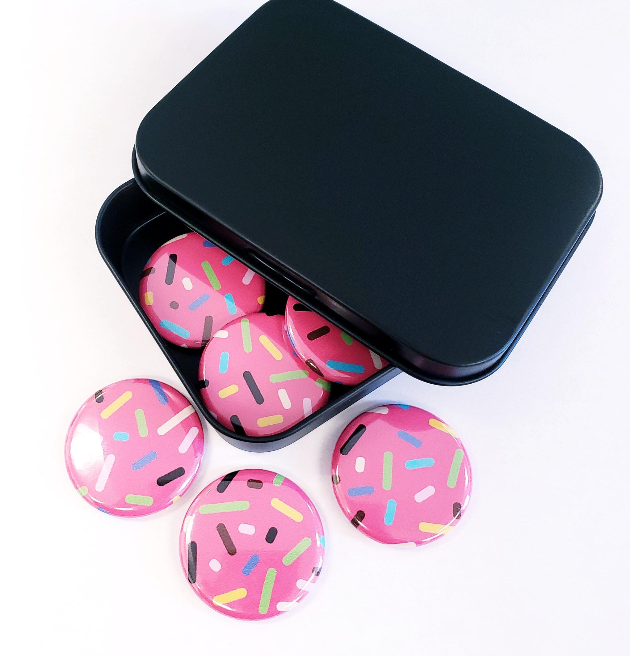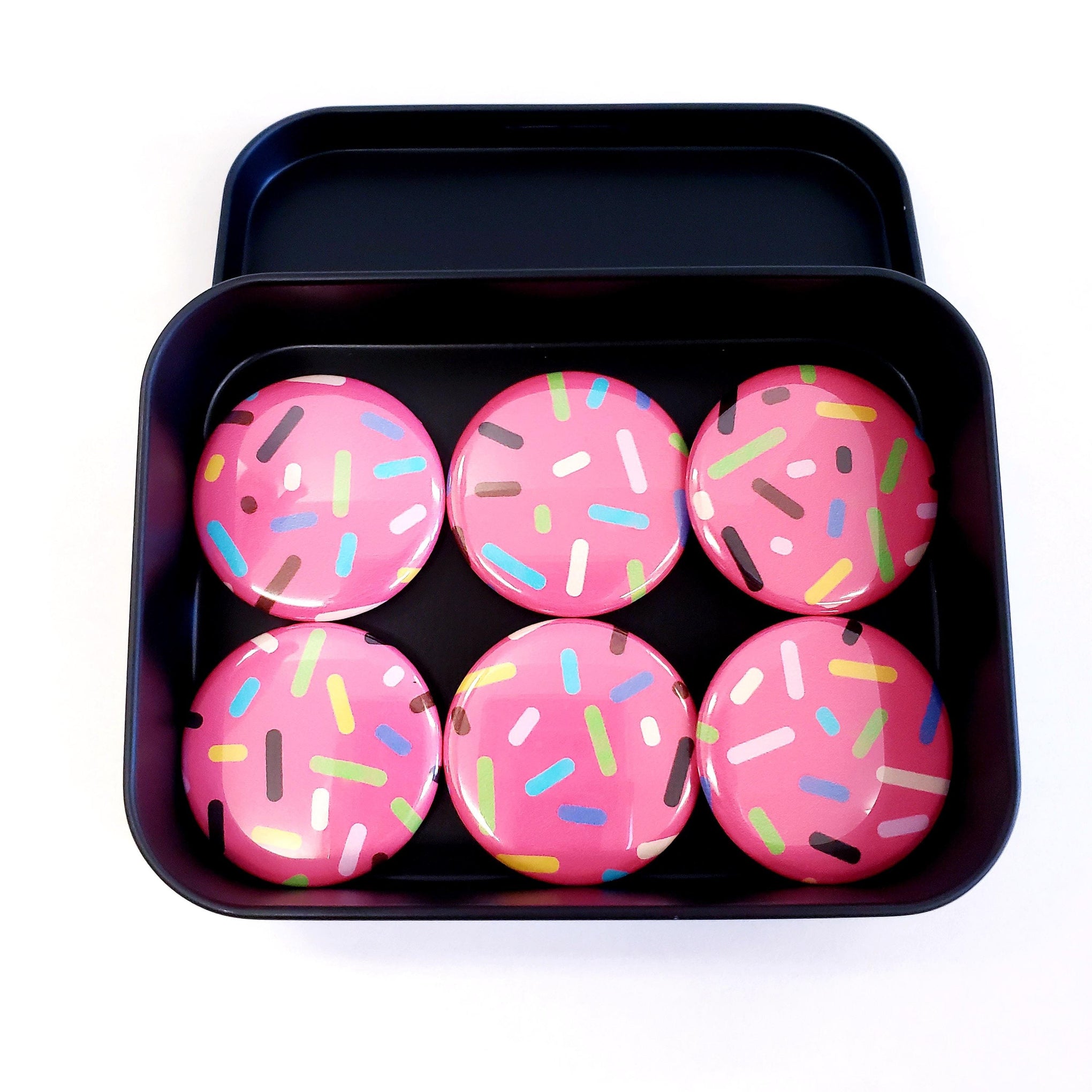Collection of six round, cute pink cupcake sprinkle pattern button magnets. Perfect for adorning your refrigerator or any metal surface.