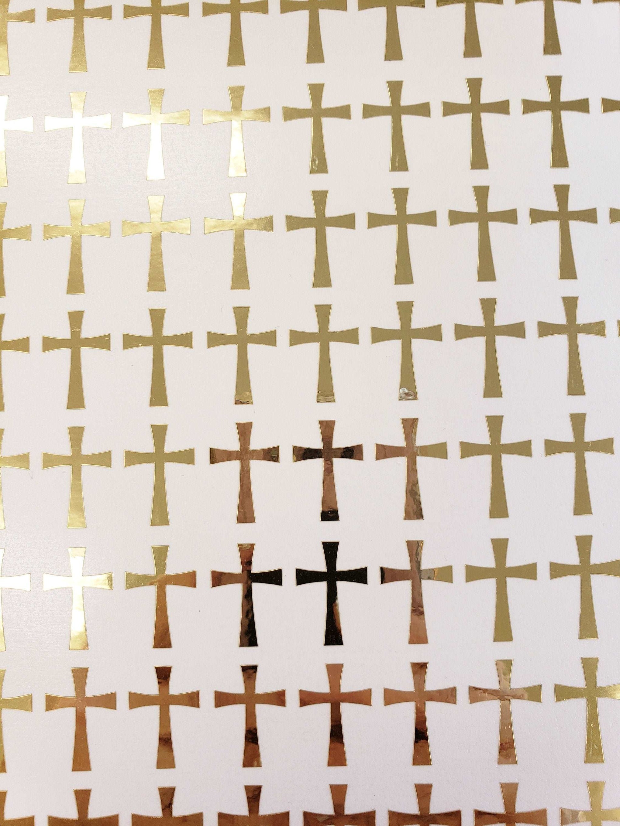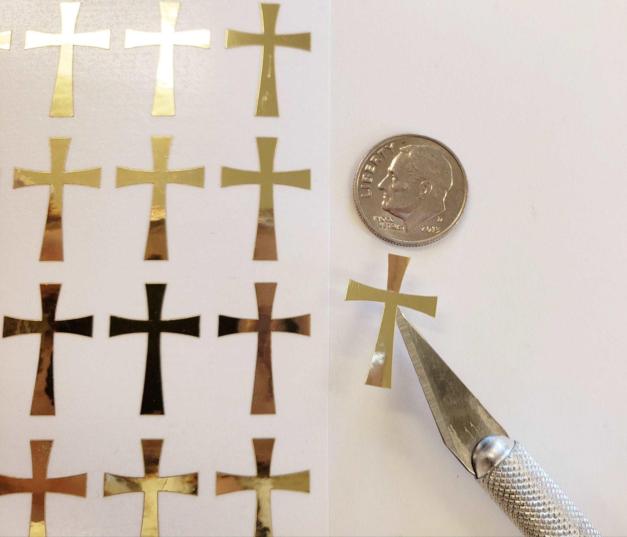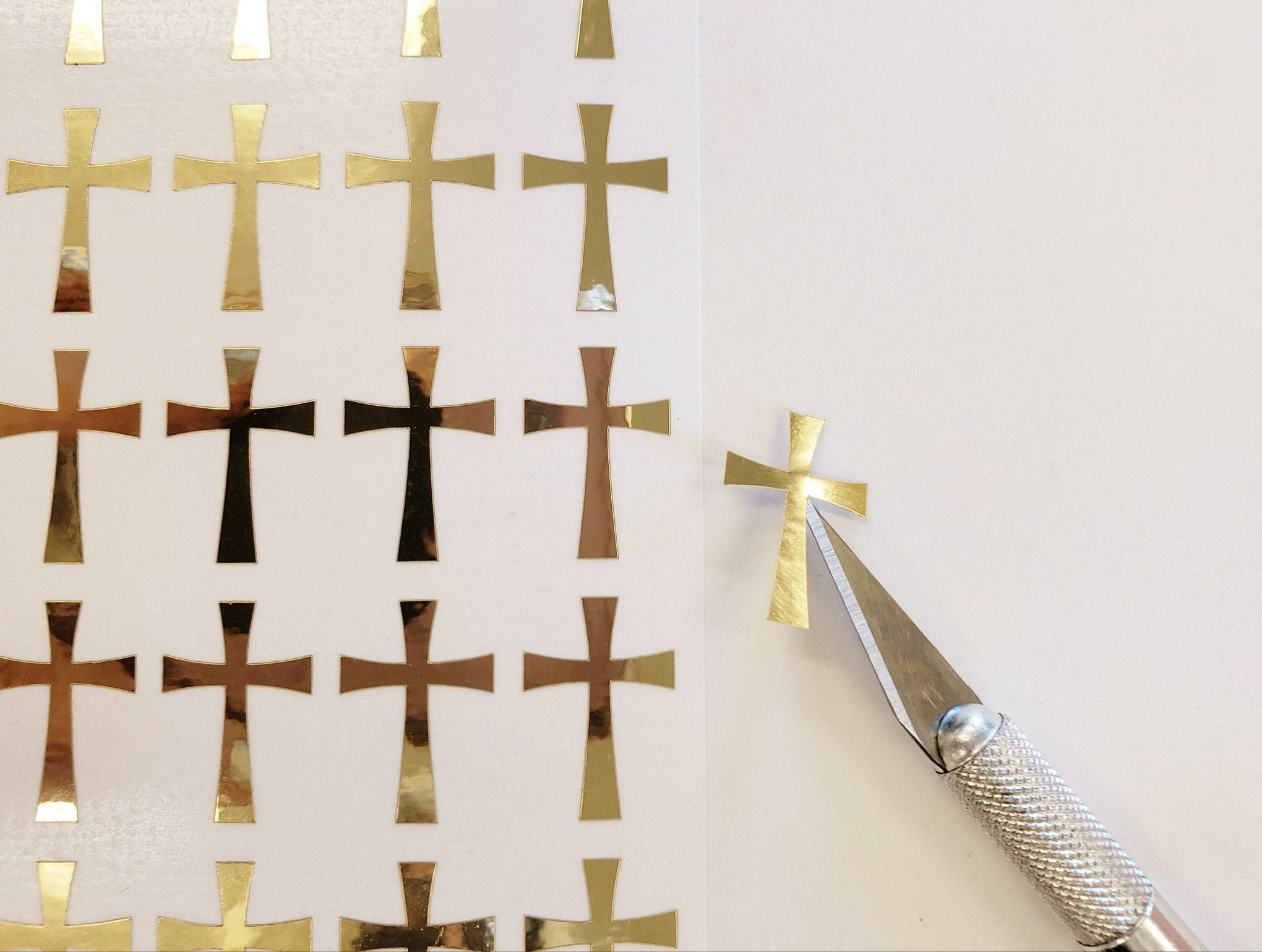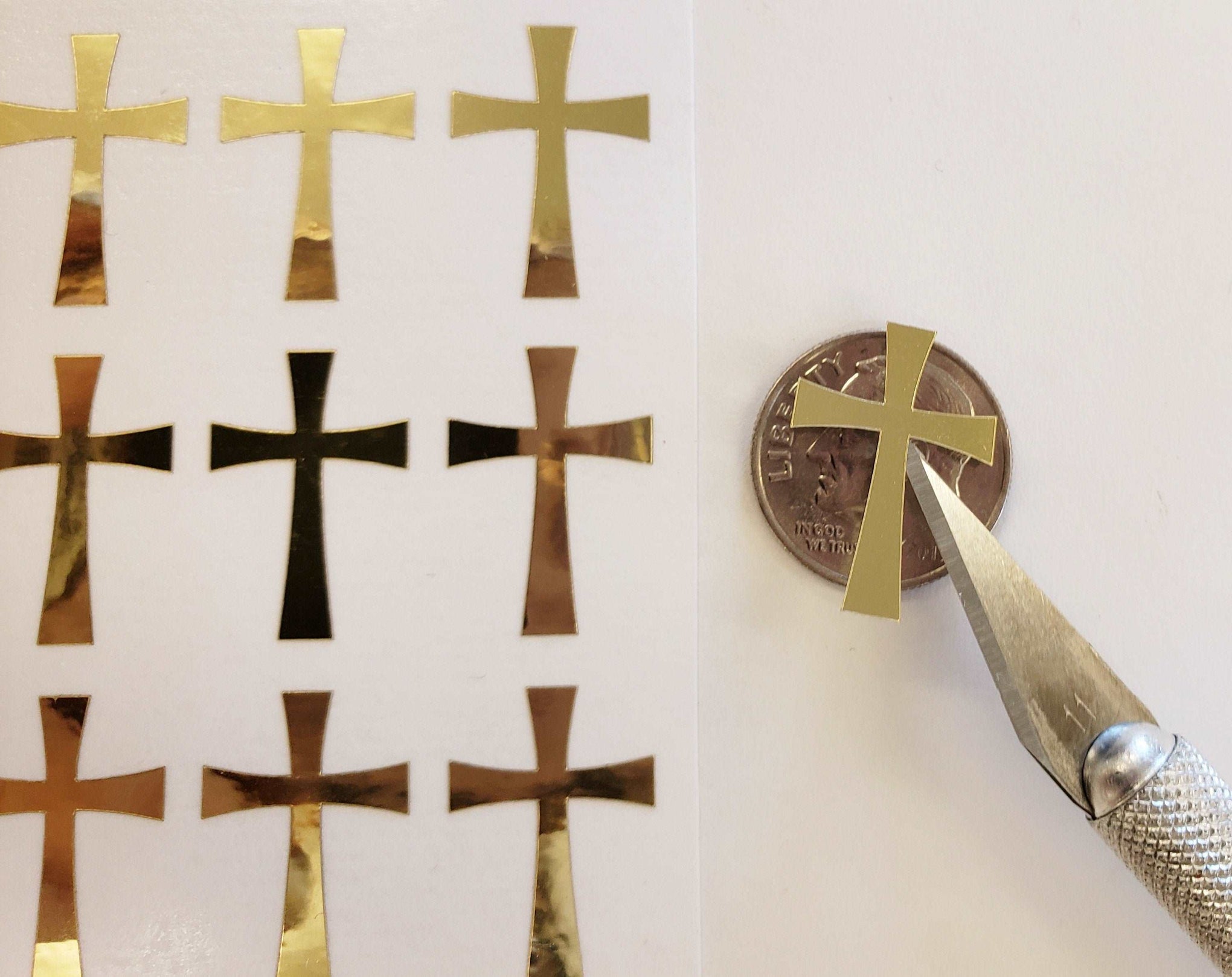 GOLD RELIGIOUS CROSS STICKERS. Elegant gold cross sticker sheet of 50 or 100 peel and stick small religious cross decals. No transfer tape needed, just the tiny crosses! The stickers are made from adhesive vinyl and have a glossy gold mirror finish. Perfect for invitations to a first communion, baptism, money envelopes for weekly church service, wedding invitations and much more!