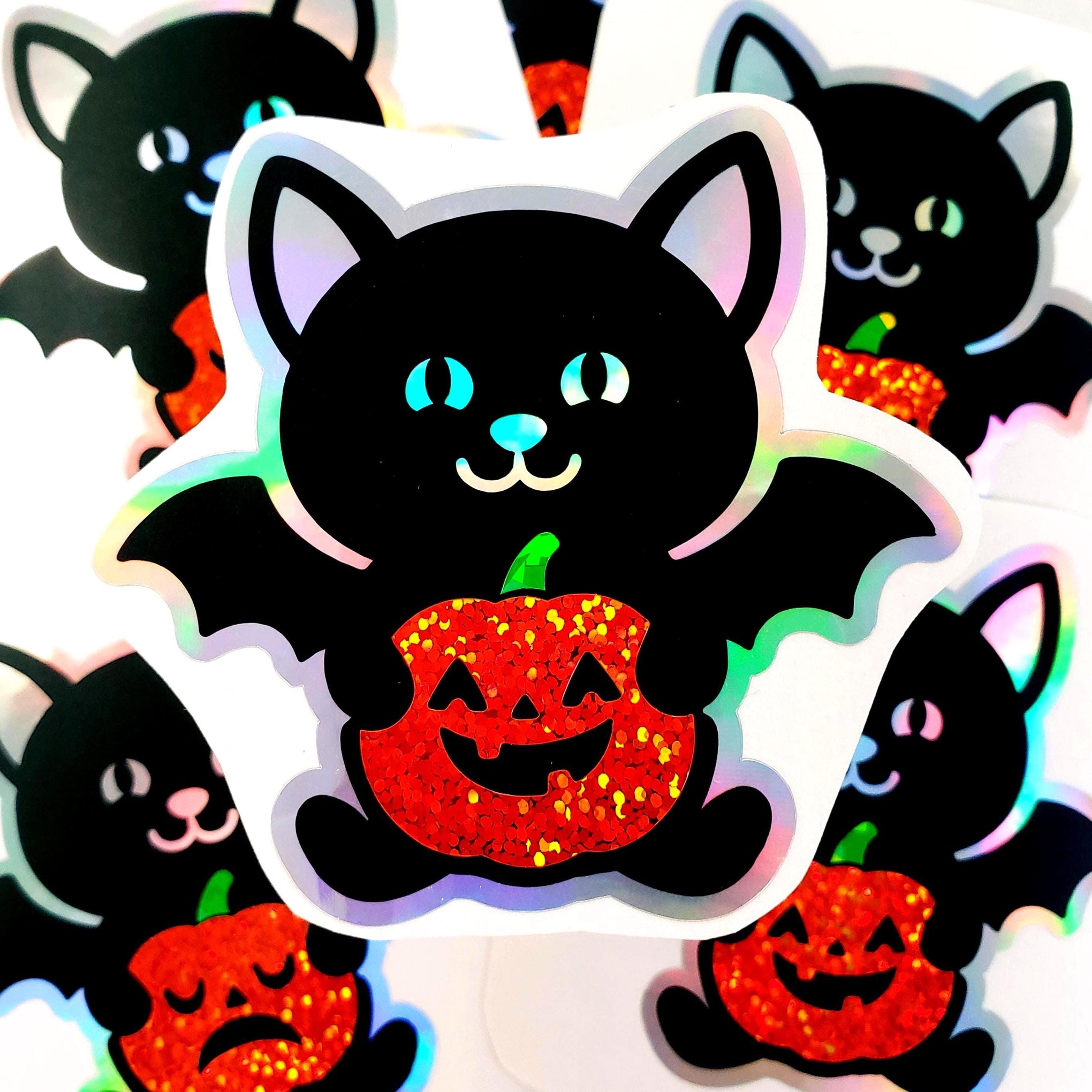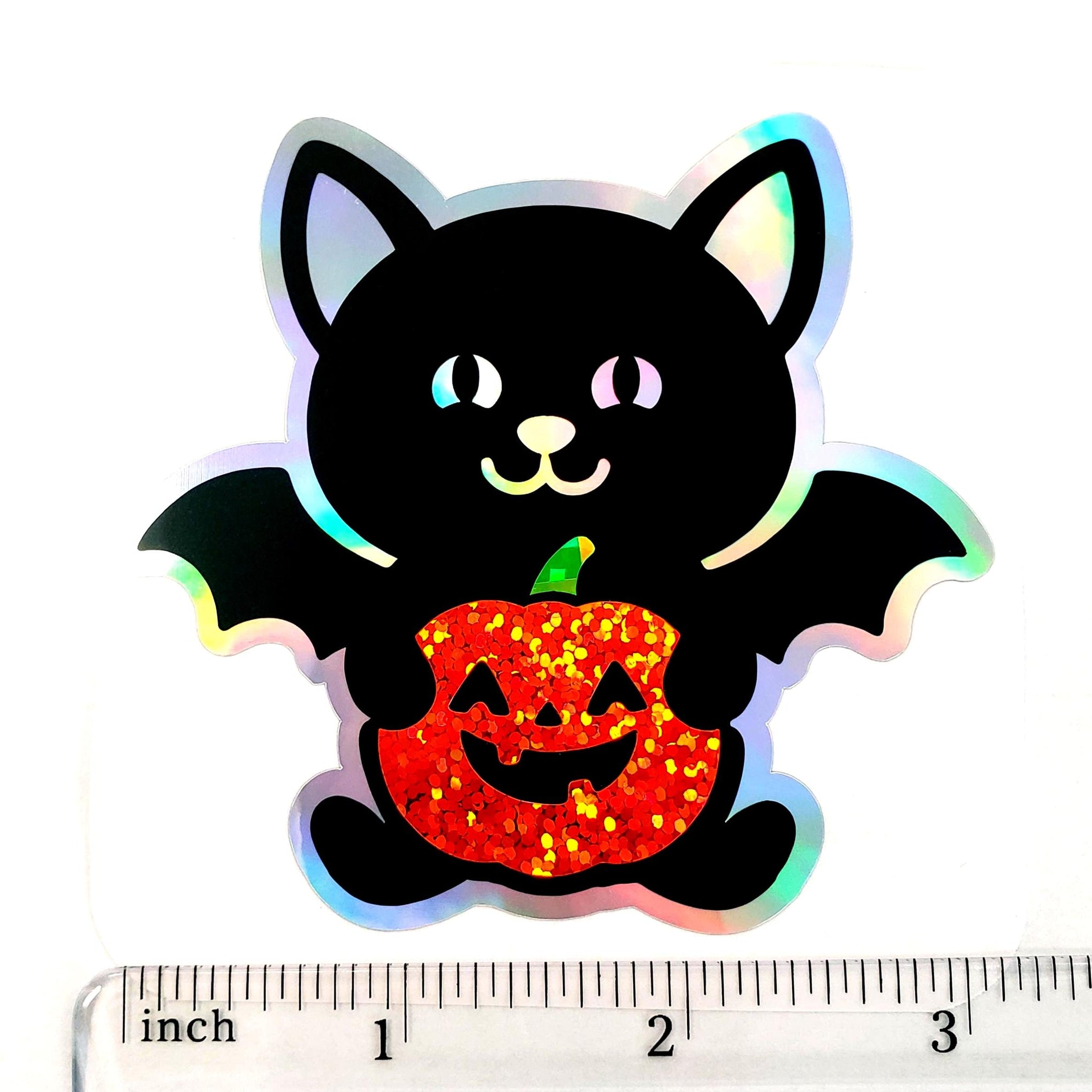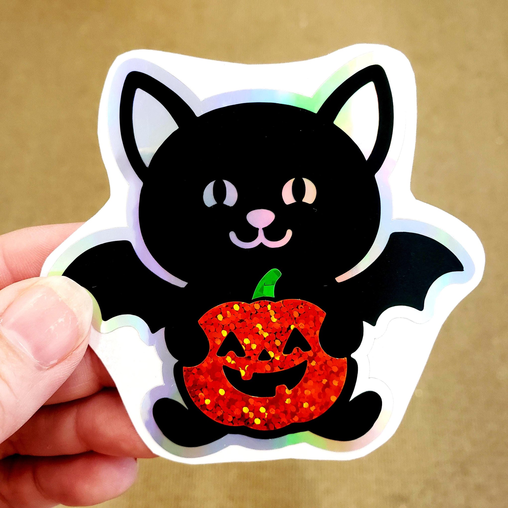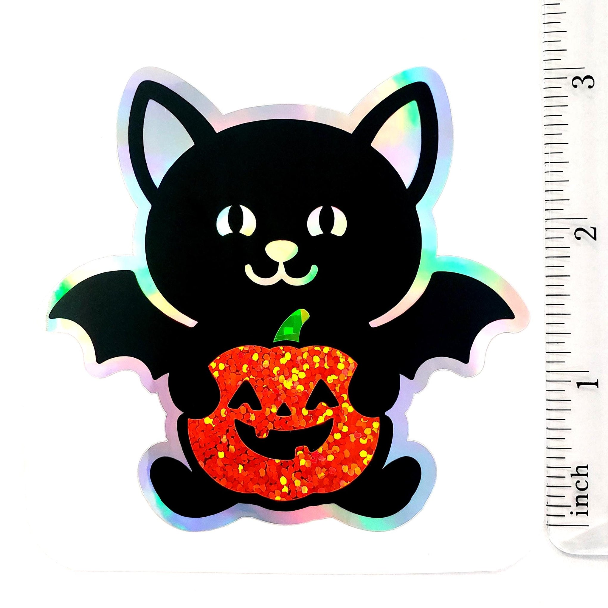 Halloween Black Cat with Bat Wings Sticker, Silver Outline