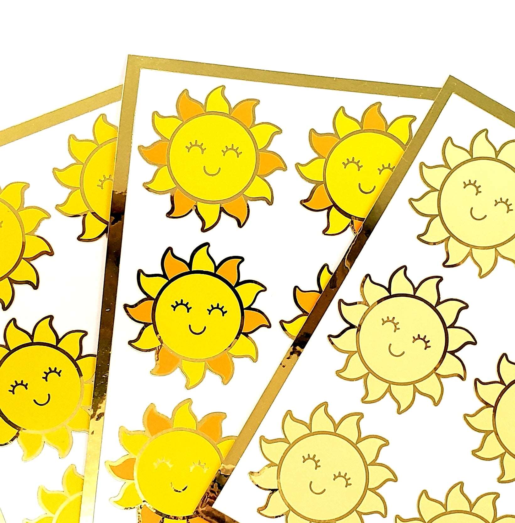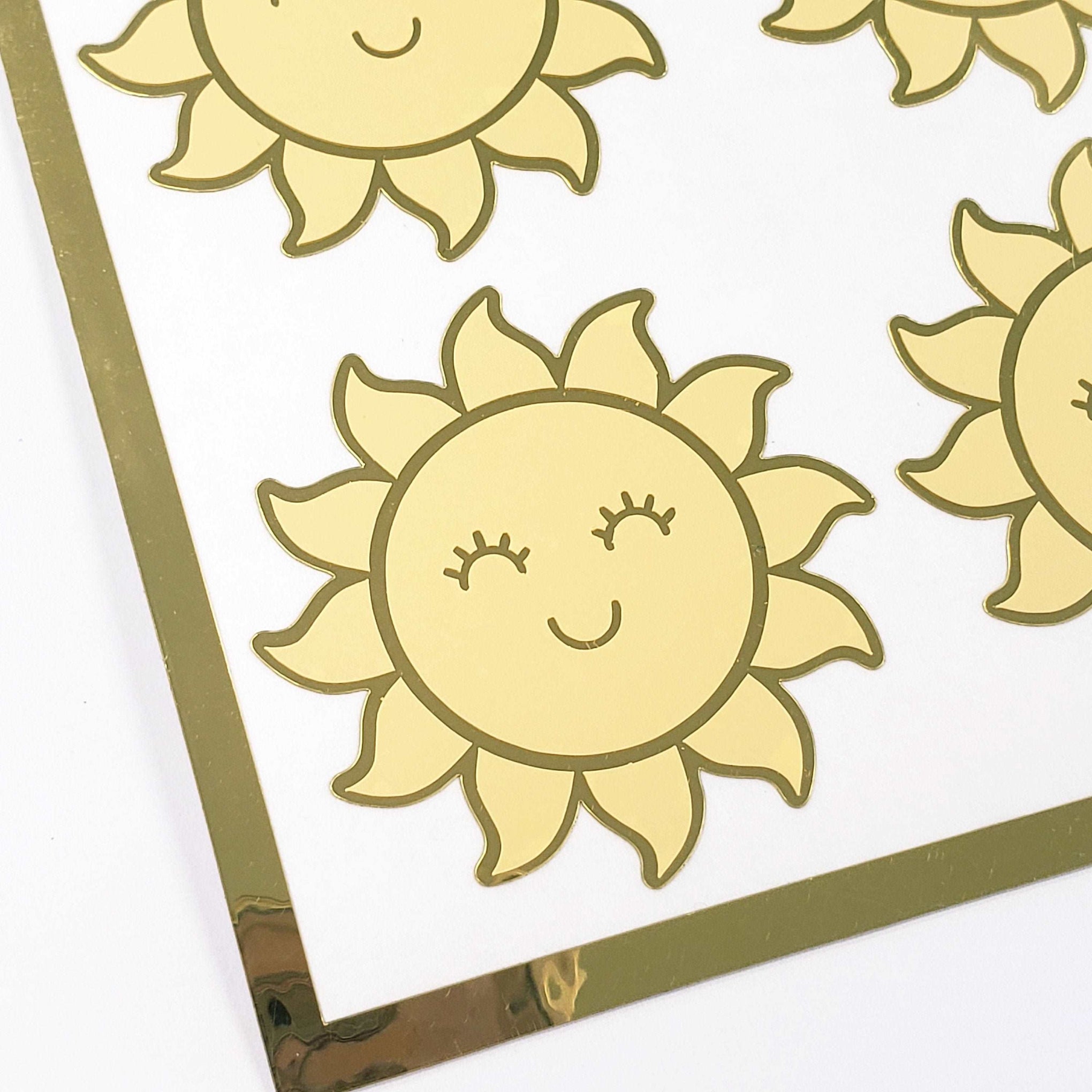 These happy yellow and gold sun shaped stickers are the perfect addition to any crafting project or decoration. They are made of a durable adhesive vinyl material. Each sun sticker measures approximately 1.5 inch, making them the perfect size for adding a touch of shine to a variety of surfaces. Whether you're looking to add a pop of color to a scrapbook page, embellish a greeting card envelope, or add some sparkle to a gift, these smiling sun shaped stickers are sure to brighten up any project.