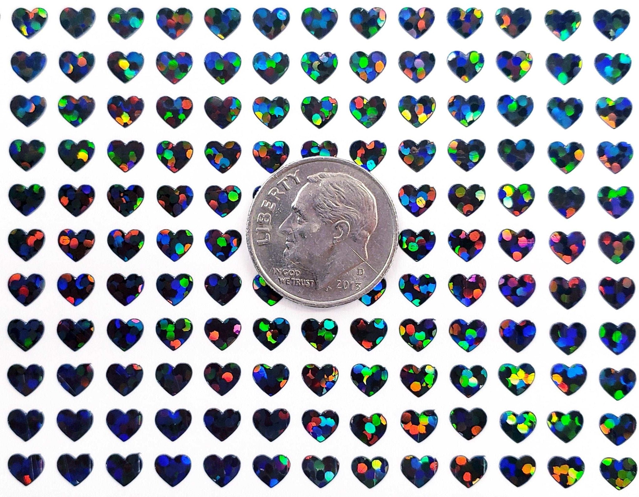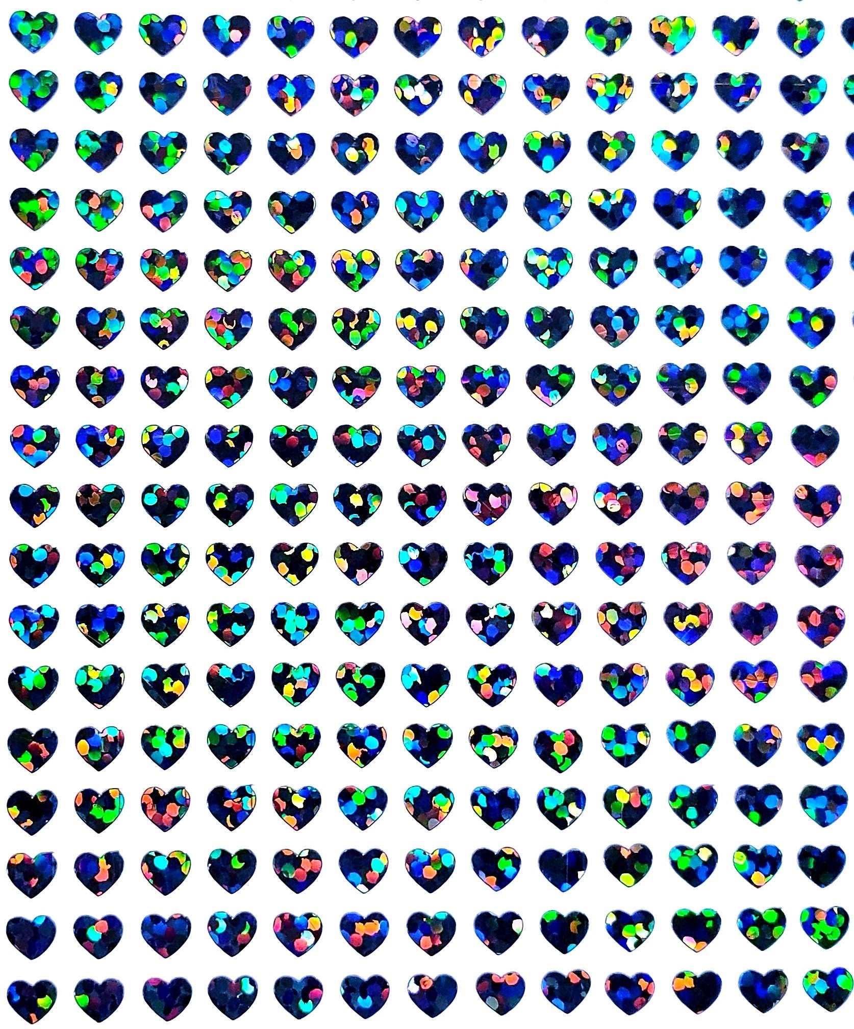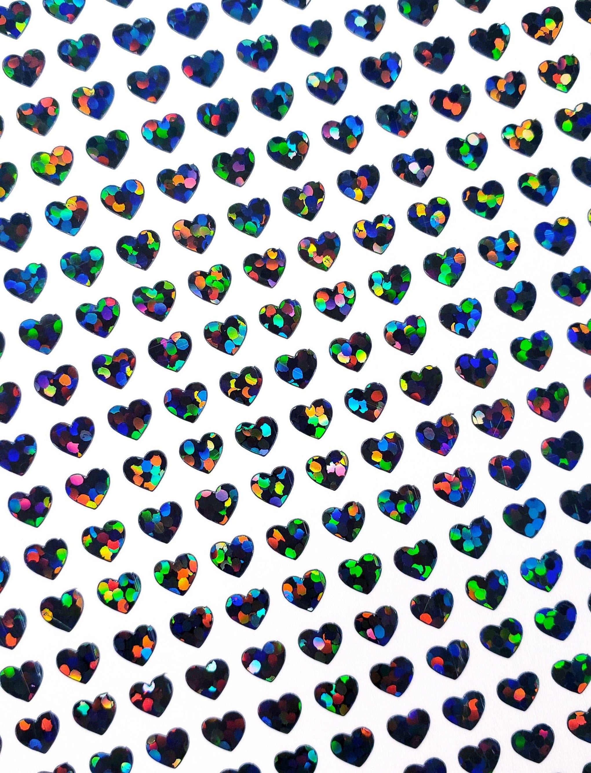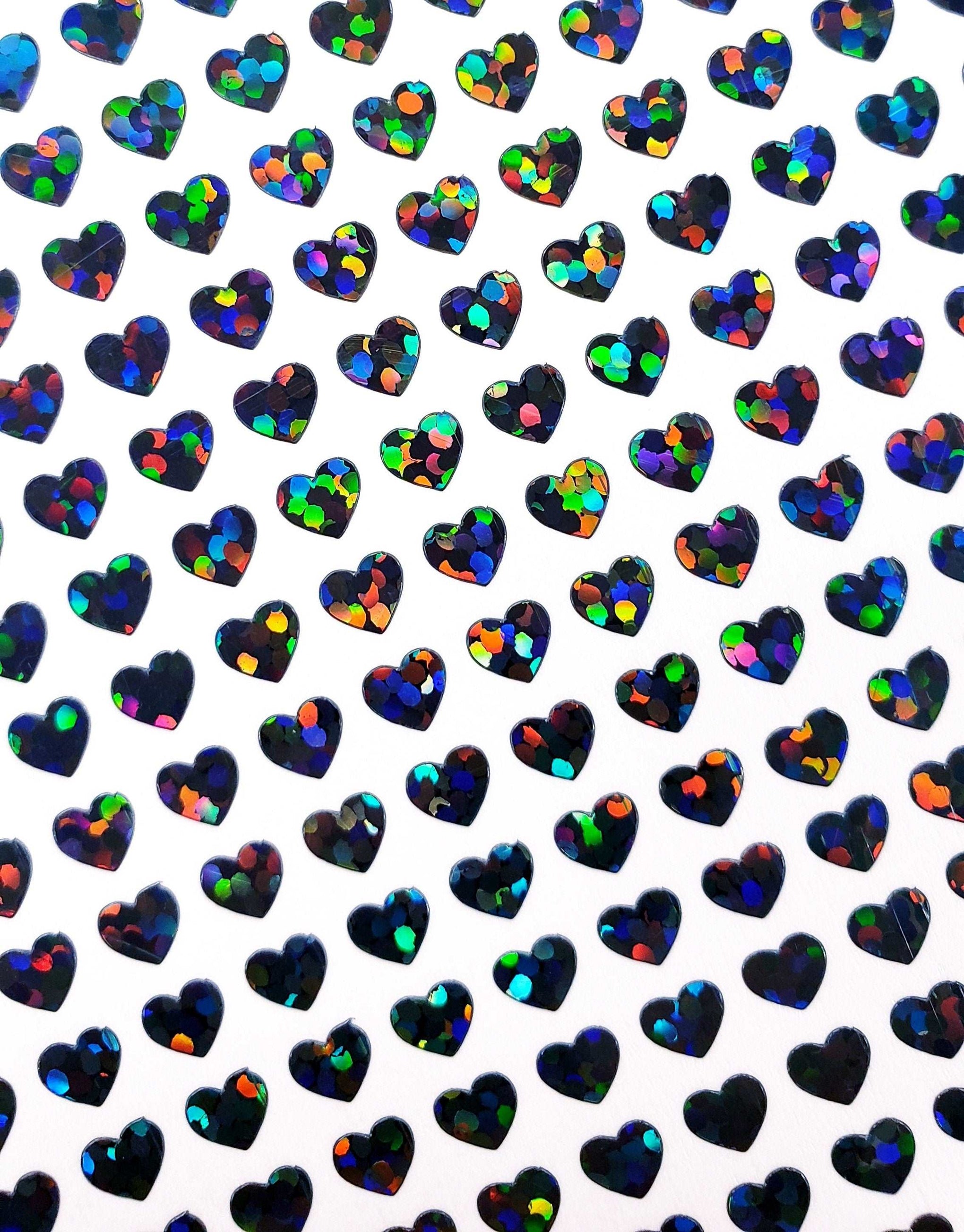 EXTRA SMALL HEART STICKERS. Set of 640 micro sized sparkly black heart glitter stickers. No transfer tape needed, just the extra small hearts! The stickers are made from vinyl and will adhere to paper, cardboard, notecards, place cards, ornaments, envelopes, junk journals, badge reels, invitations, planners, phone cases, laptops, toploader card sleeves, keychains, plastic, metal, glass, painted wood and many more smooth surfaces. Glitter stickers are smooth and do not shed glitter.