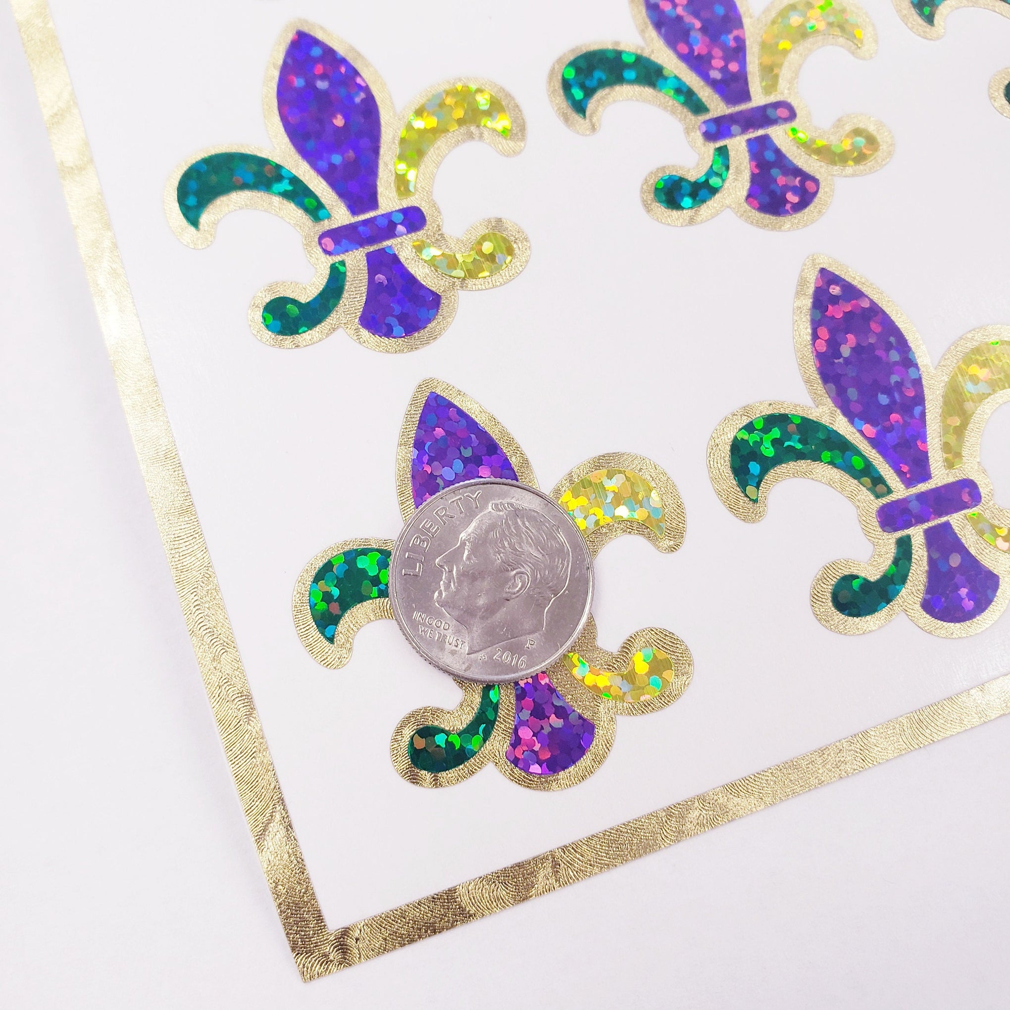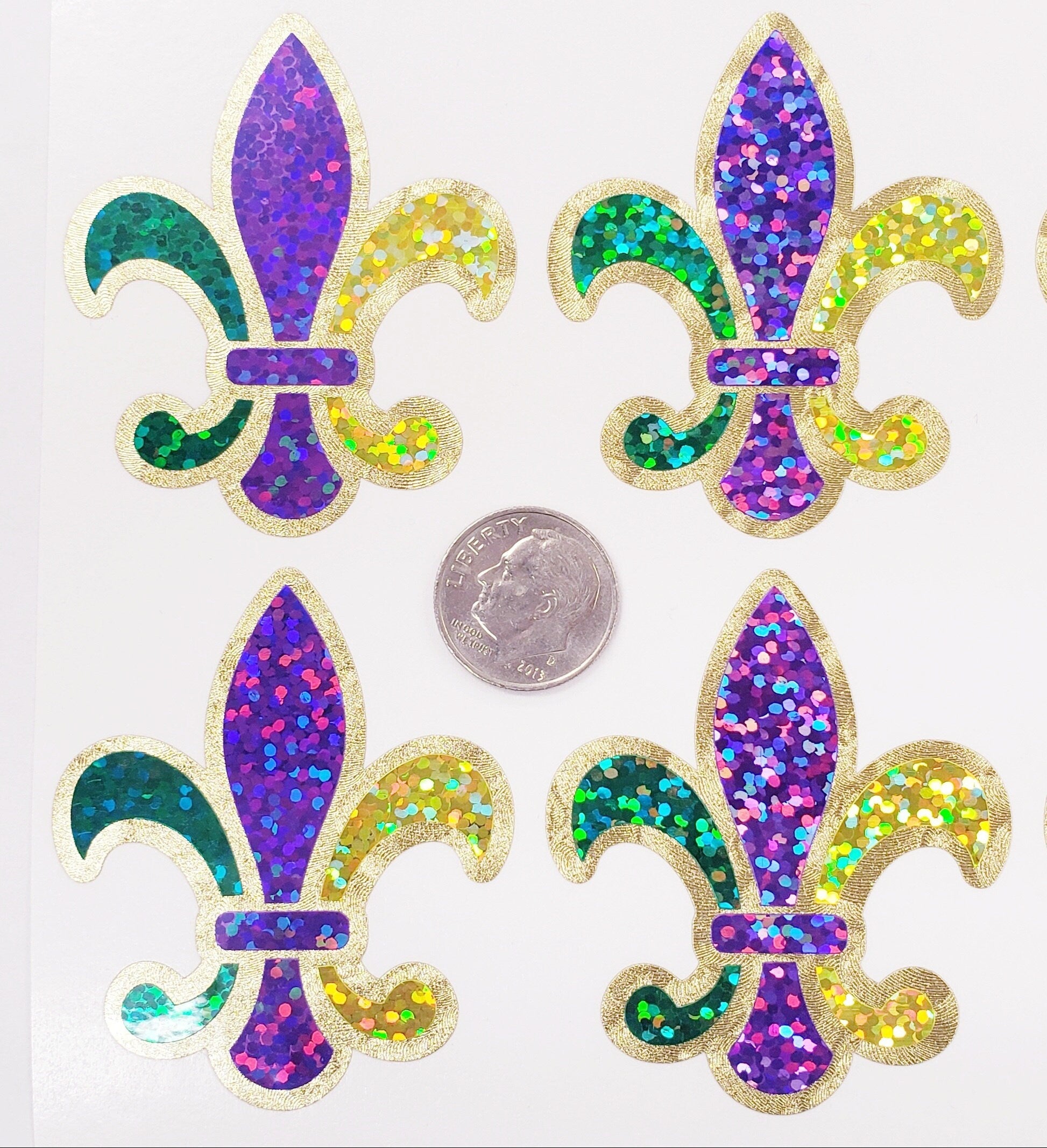 FLEUR DE LIS STICKERS. Set of 12 Louisiana style fleurs in the traditional colors: green, purple, yellow and gold. Each FDL is made from super sparkly vinyl with a gold outline. No transfer tape needed, just the French fleurs! The stickers are made from vinyl and will stick to paper, cardboard, signs, planners, laptops, envelopes, scrapbooks, phone cases, laptops, keychains, hurricane glasses, plastic, metal, glass, painted wood and many more smooth surfaces. Any drinkware with stickers should be handwashed.