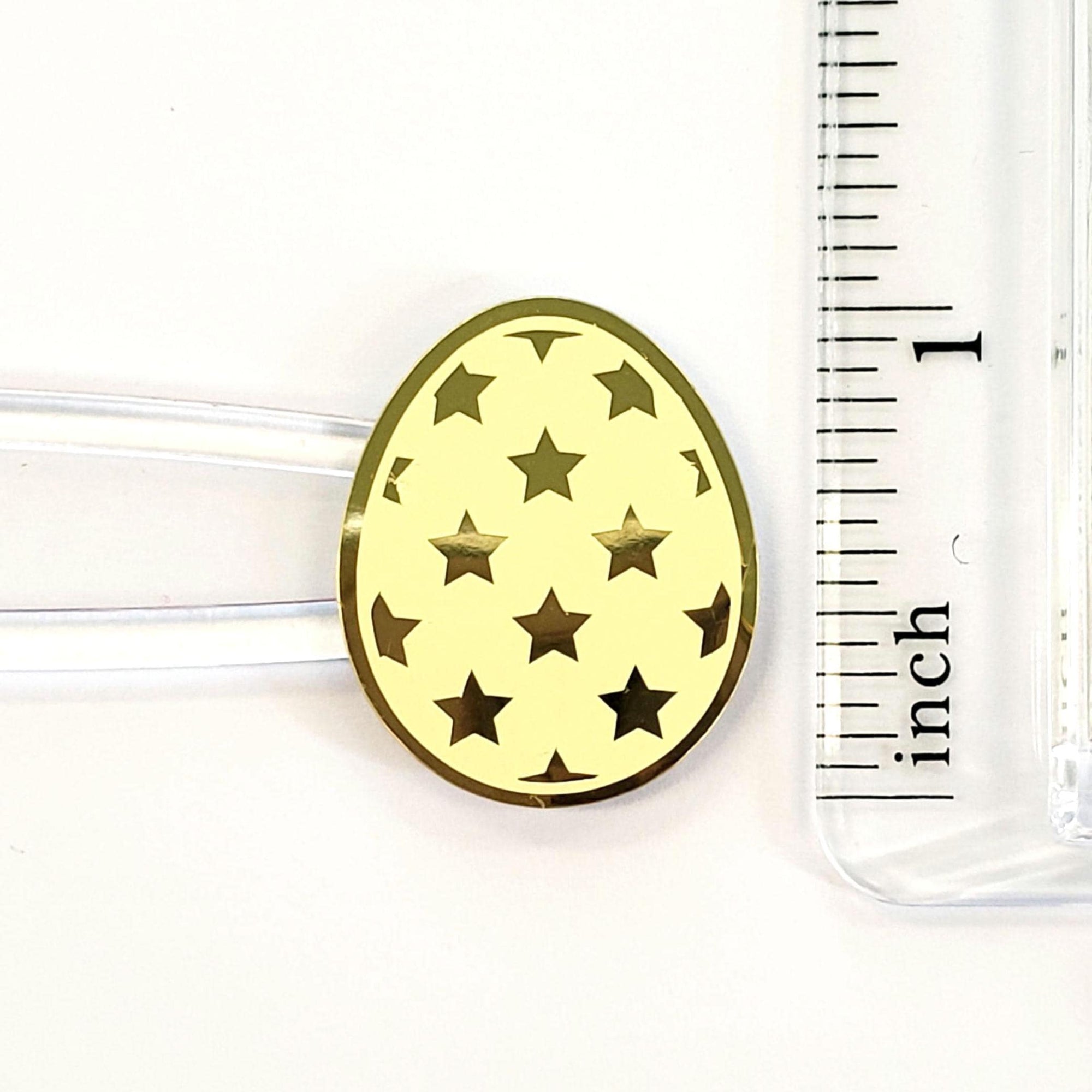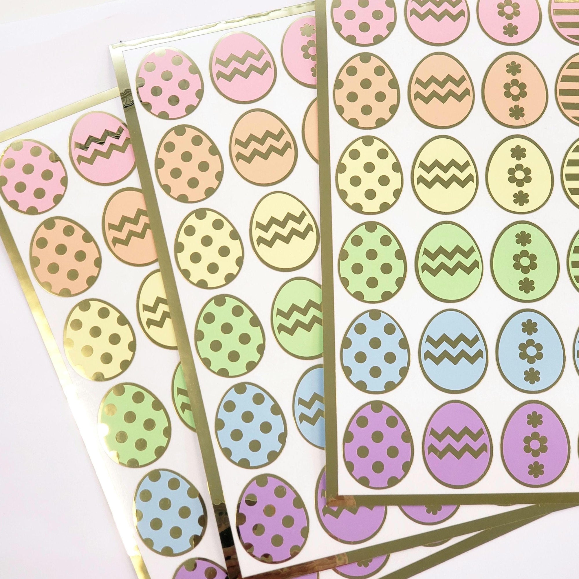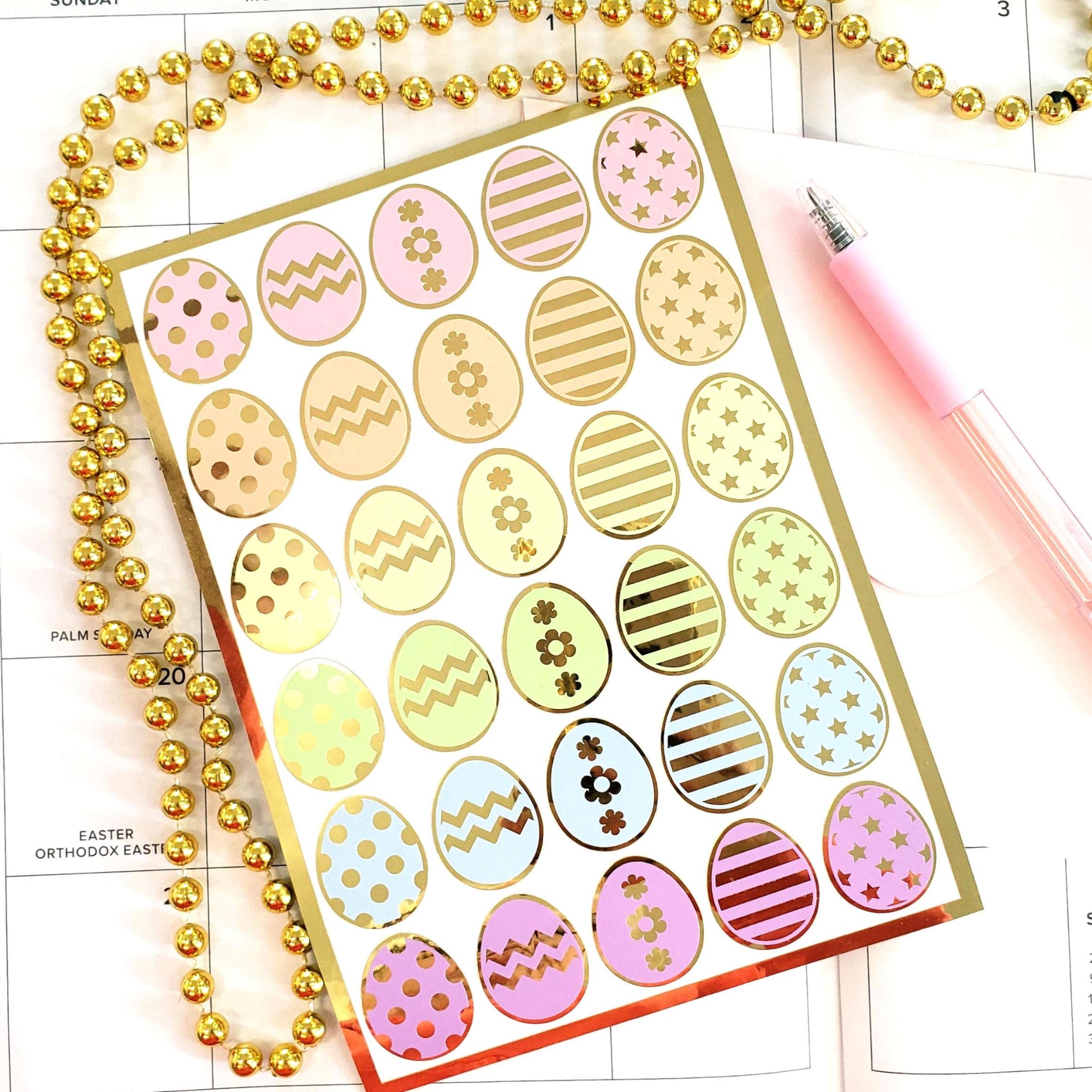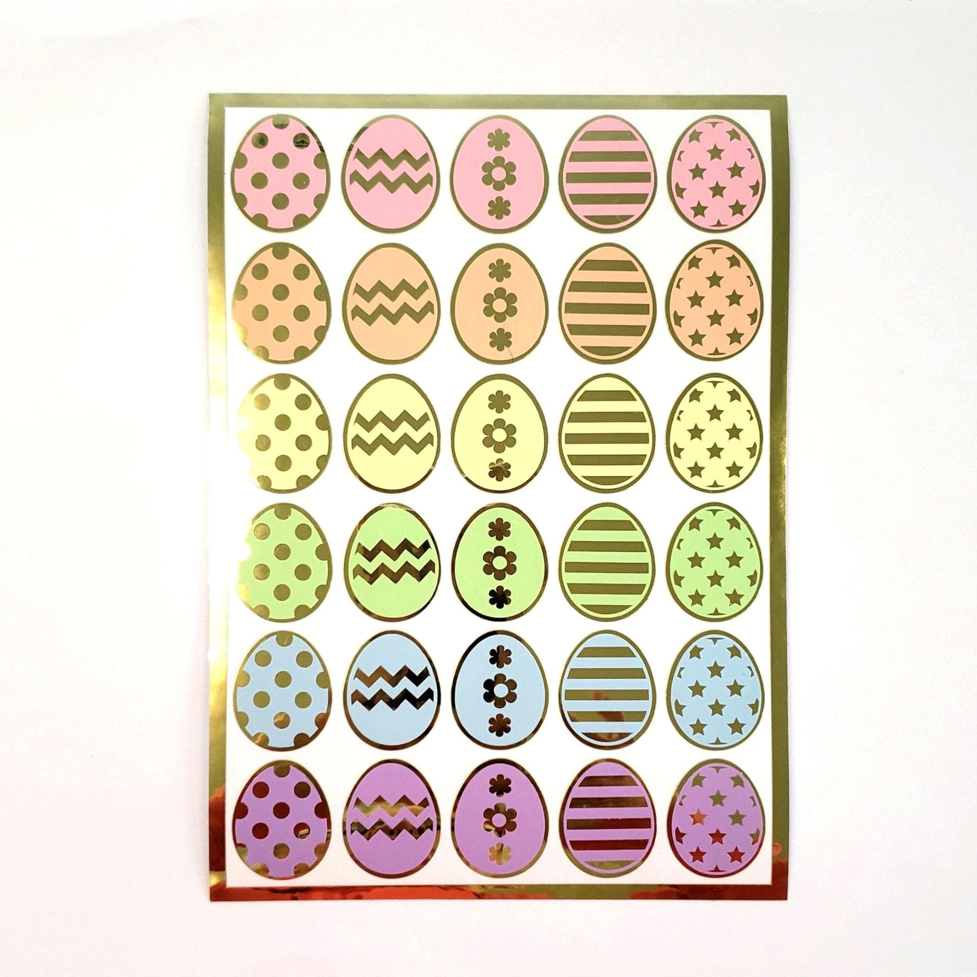 Brighten up your spring projects with this charming set of 30 pastel color Easter egg stickers, each accented with a shiny gold outline and different patterns! These small egg stickers are perfect for decorating cards, scrapbook pages, birth announcements, and more.