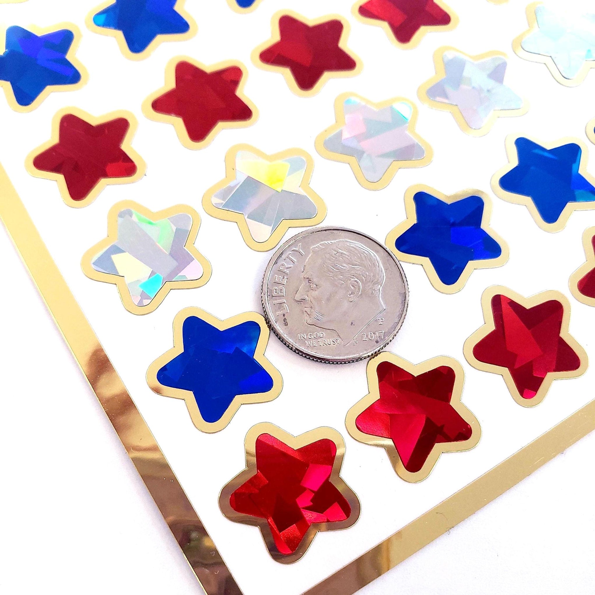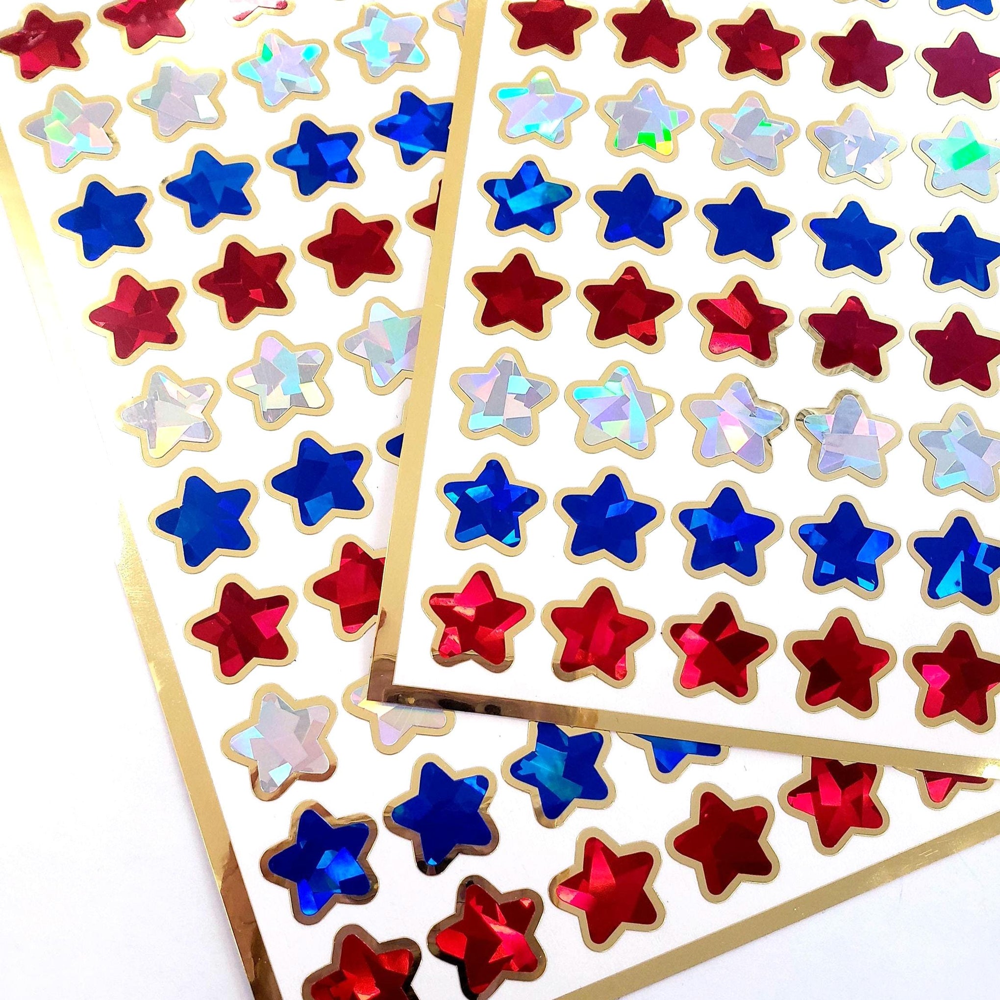 Set of 70 patriotic sparkly star stickers in red, white, and blue, each adorned with a mirror gold outline. These small stickers are an excellent choice for adding a distinctive touch to your upcoming projects. Ideal for Flag Day, military memorial cards, Memorial Day decorations, Fourth of July parties, Veterans Day, scrapbooking, or any other papercraft.
