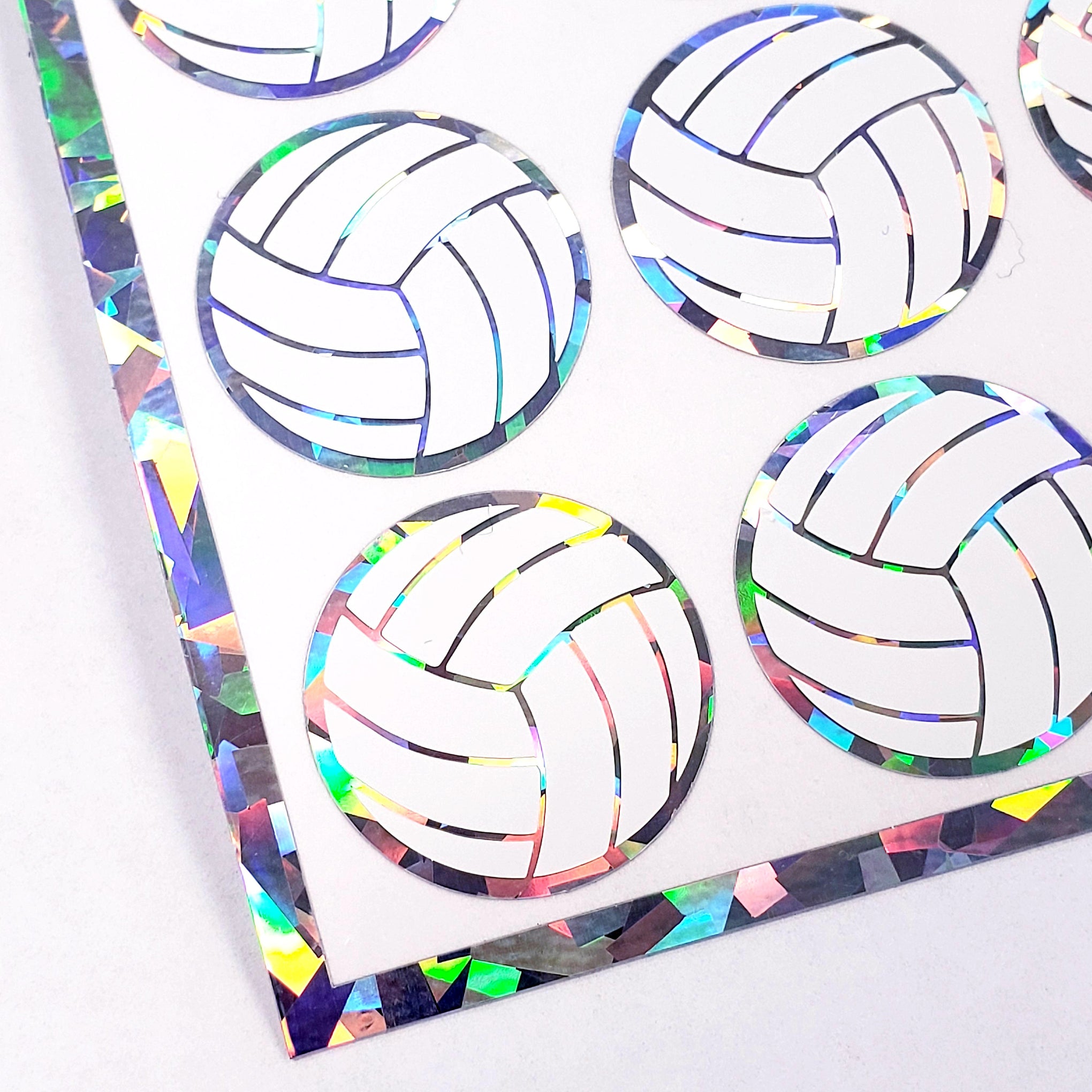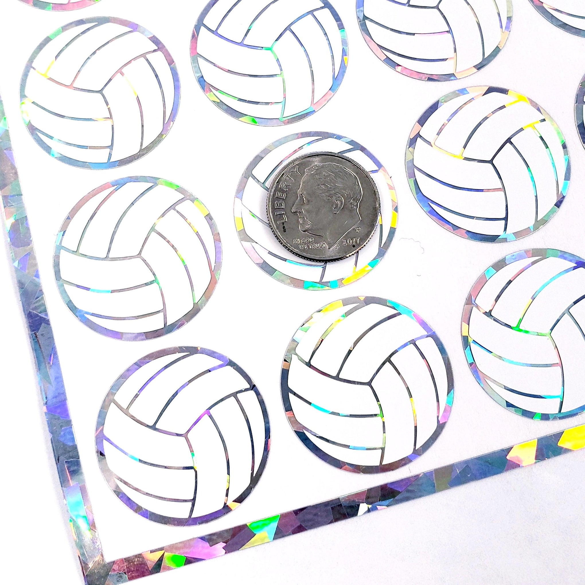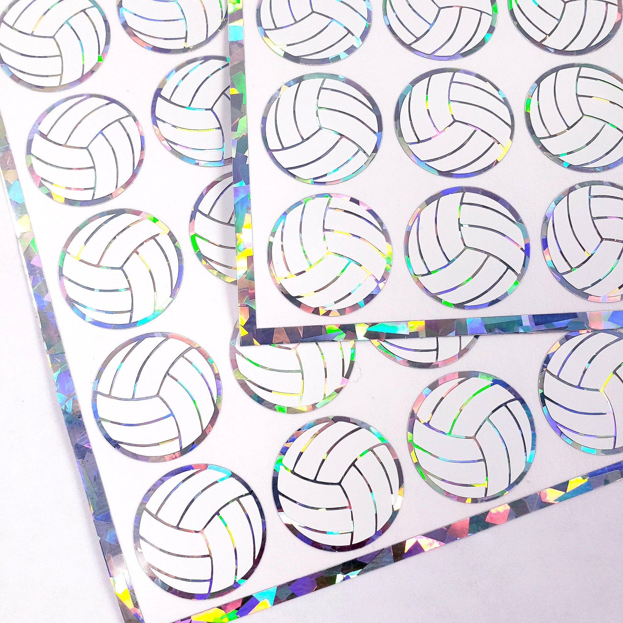 VOLLEYBALL STICKERS. Hey volleyball fans! Check out these awesome volleyball stickers! Each sheet packs a punch with 24 volleyballs. Each of these babies measures 1 x 1 inch, perfect for sticking just about anywhere. Simply peel and stick.