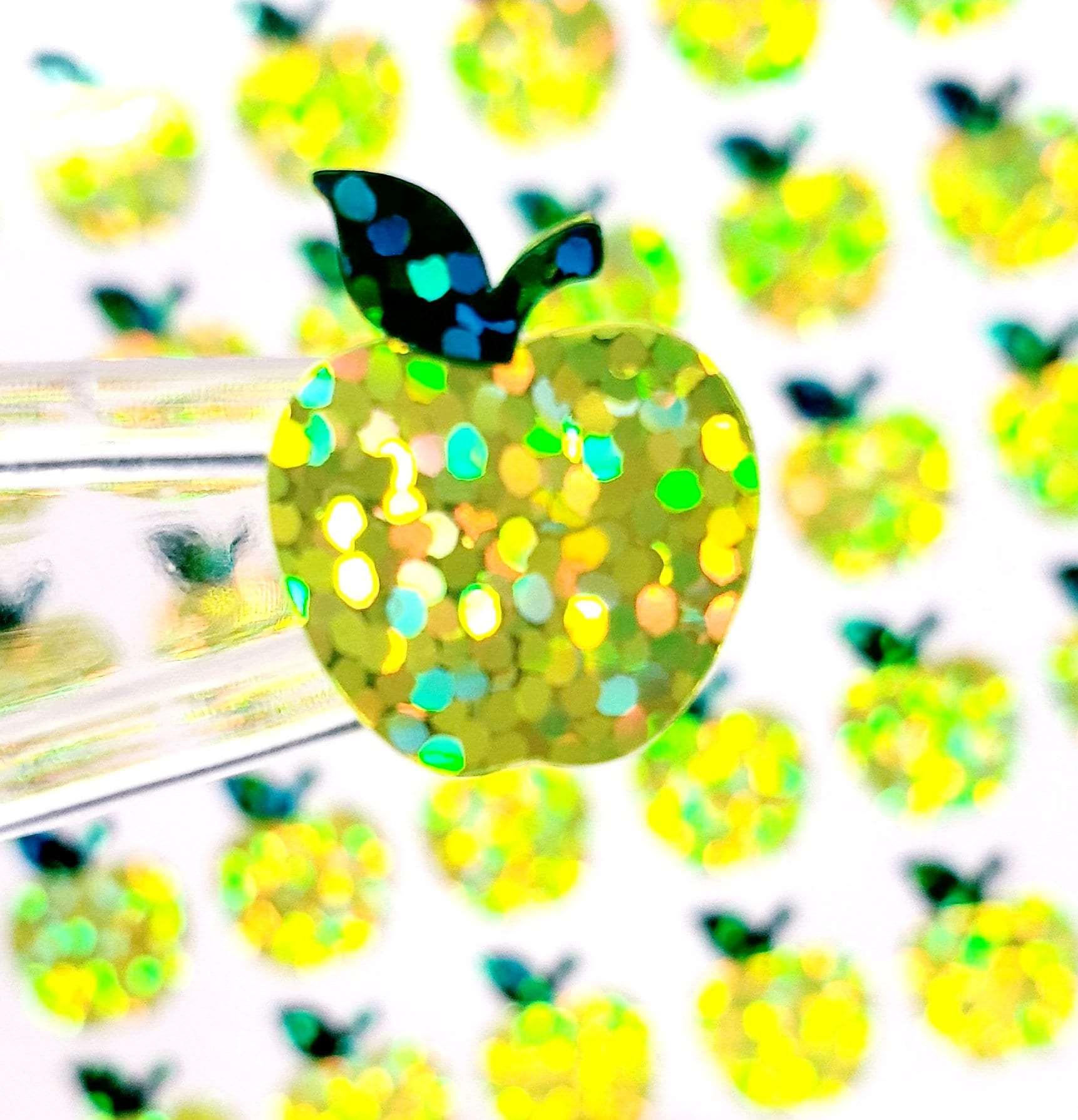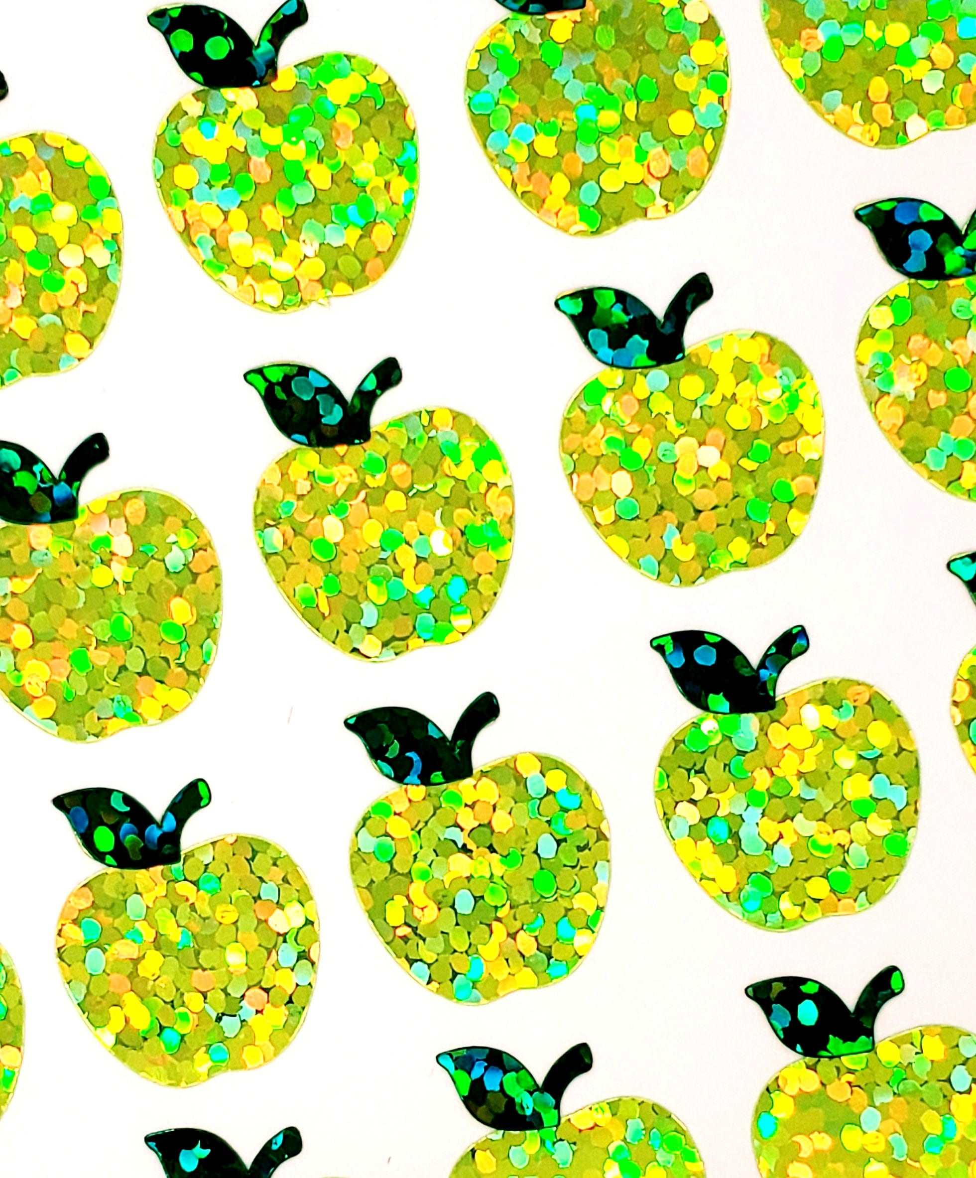 Yellow Green Apples Sticker Sheet. Looking for a fun and unique way to label your apples? These granny smith glitter apple stickers are perfect! They're great for meal planning, apple picking signs, smoothie labels, apple pie recipe cards, back to school stickers for teacher classrooms, farmers market fruit labels and more. Plus, they add a touch of sparkle and personality to any project.